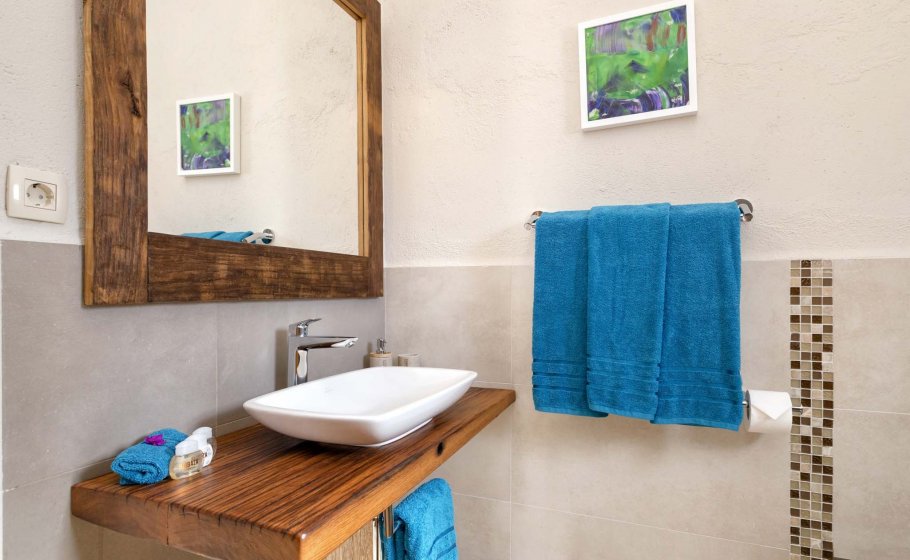 The first door on the right leads to a smaller bedroom with a double bed (180cm x 200cm), an en-suite bathroom with a shower tray, glass balcony doors and a smaller balcony. The view, as it does in all the corners of the Villa Selene In The Mirror, falls on the calming blue color of the sea and the relaxing green color of the forest.