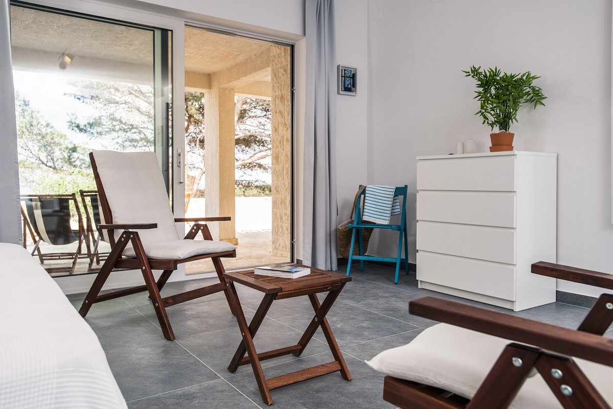 A wooden staircase leads from the high ground floor to the upper floor, where you will find two bedrooms and two bathrooms. Master bedroom is 30m2 in size. It is equipped with a comfortable double bed, and it has an en-suite bathroom with a large bath and a massage shower. Master bedroom has its own terrace of 25m2 with a stunning sea view.