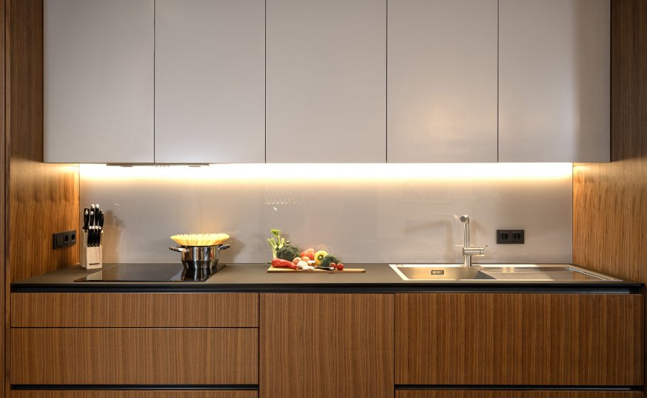 At the entrance to the apartment, there is a built-in wardrobe with a large mirror, while to the front, the space opens up with an open floor plan with a fully equipped kitchen, a dining area for 8 people, and a living room with a fireplace and smart TV. These spaces are complemented by breathtaking vistas overlooking the pool and the sea. There are two master bedrooms, each with a 200x210cm bed, a built-in wardrobe, a TV, and en-suite bathrooms, including a bathtub and a shower. In the third room, the so-called cabinet, you’ll find a TV and a sofa bed, which can stretch out to 160x200cm. The cabinet has a view of the pool and a door leading to the pool. A separate bathroom with a shower belongs to the cabinet. First apartment also has another toilet and its own utility room, with a washing/drying machine.