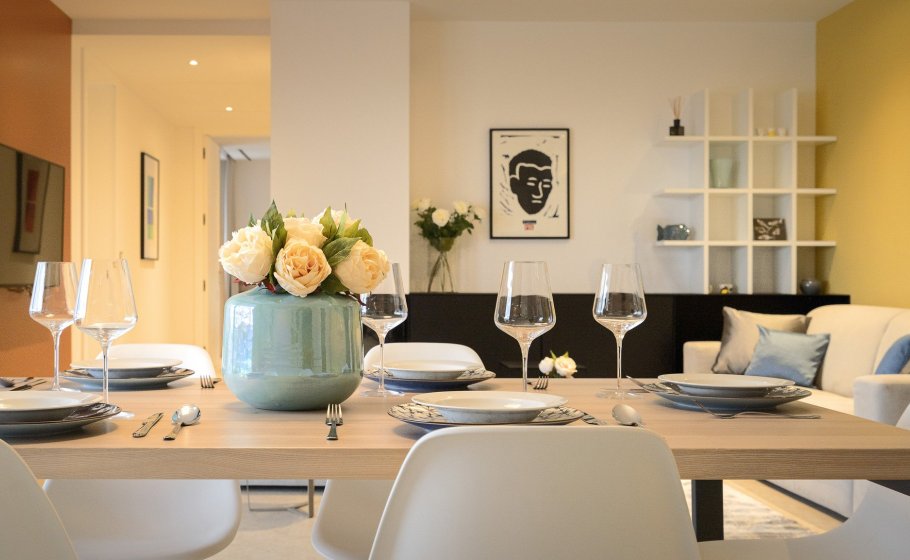 At the entrance, there is a built-in wardrobe with a large mirror, offering a view of the living room with a smart TV, a dining area for 6 people, and a fully equipped kitchen. There is one master bedroom with a 180x200cm bed and a TV, an en-suite bathroom with a bathtub and a washing machine, plus another bedroom with a 180x200cm bed, a TV, and a separate bathroom with a bathtub.