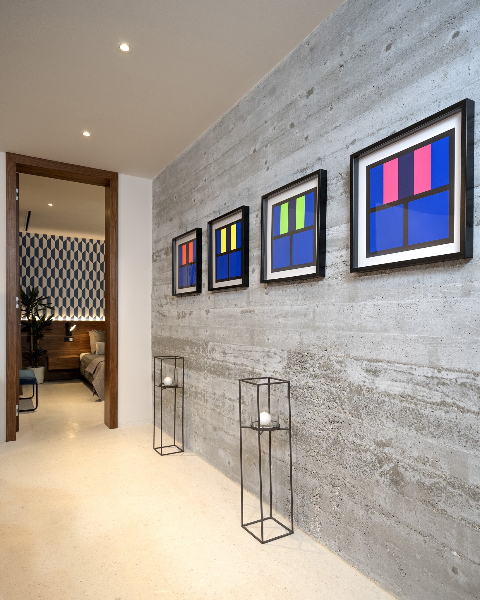 All of the interiors are minimalist (as well as the exteriors) and have custom-made furniture, designer lightning, and other pieces like artwork of well-known local artists. The colors and patterns of the villa are perfectly intertwined, while the materials and details complement them even more.