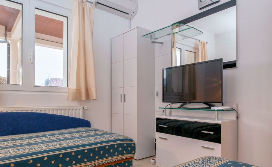 On the first floor there are 4 spacious en suite double bedrooms with matrimonial beds. Each room has AC and satellite TV. An extra bed for 1 person can be added in the master bedroom, if necessary.
