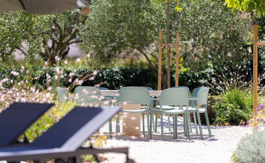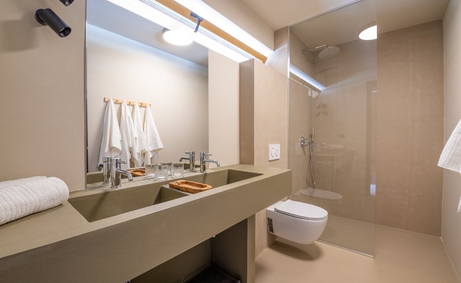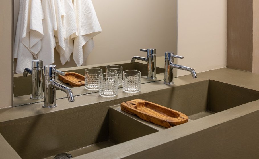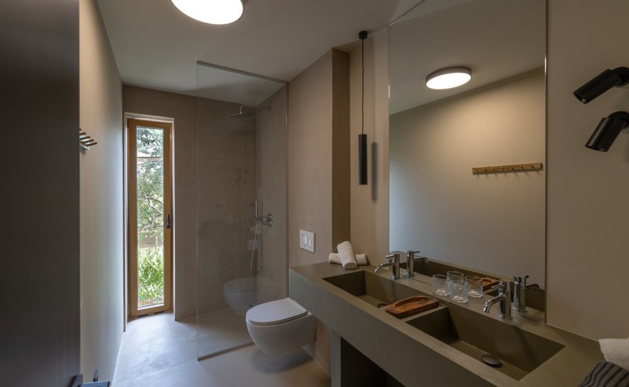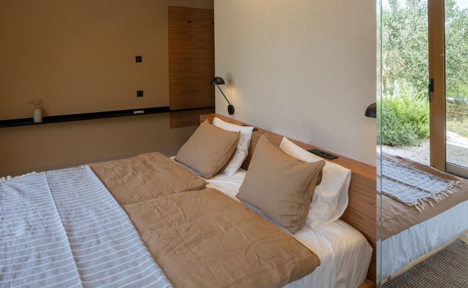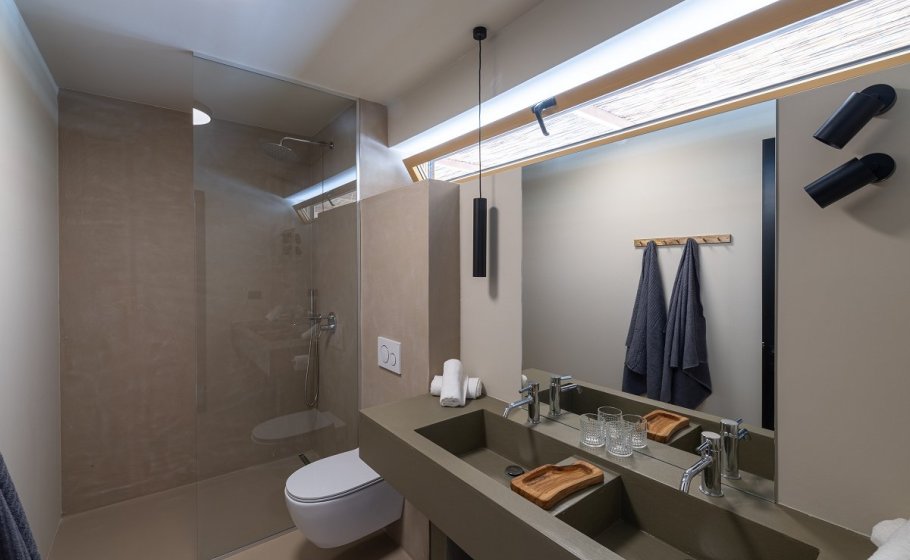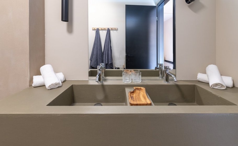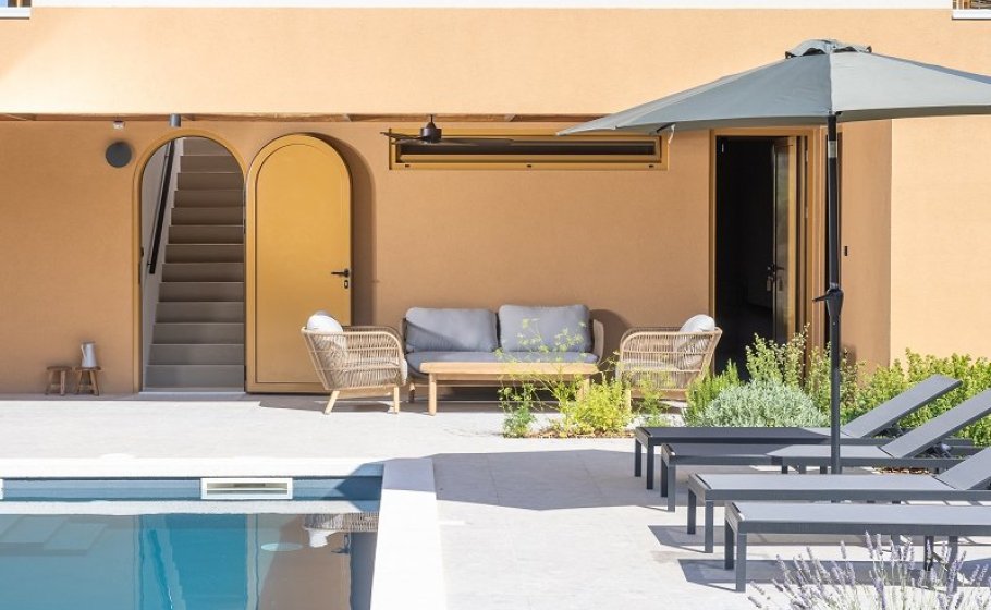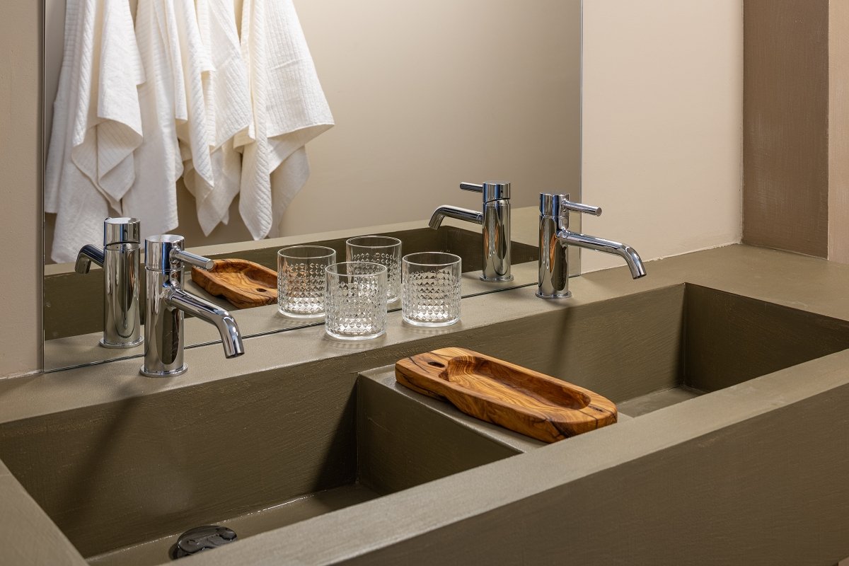 Villa Ceto has five bedrooms and five bathrooms, all opening directly onto a large veranda, which flows seamlessly into the Mediterranean garden, complete with olive trees, lush plants, and a stunning 40m2 heated pool. The pool, equipped with a “sitting shelf”, is maintained through hydrolysis, eliminating the need for chemicals. Nearby, a large concrete table seating 10 and a barbecue pit invite outdoor dining, and there is also an outdoor shower with both hot and cold water.