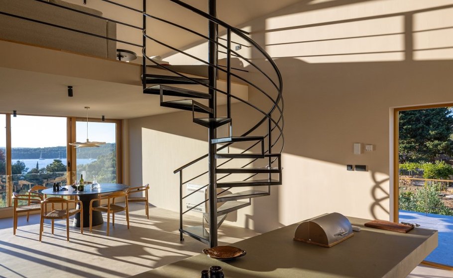 A stunning chapel-style section of the villa is accessible after ascending around 20 steps from the ground floor. This bright, airy space is fully glazed with retractable windows that open to reveal mesmerizing sea views. It includes an open-plan kitchen and dining area, with a round table seating 10. A spiral staircase leads to a mezzanine lounge, offering more fantastic views and cozy sofas for TV watching or simply enjoying the scenery.