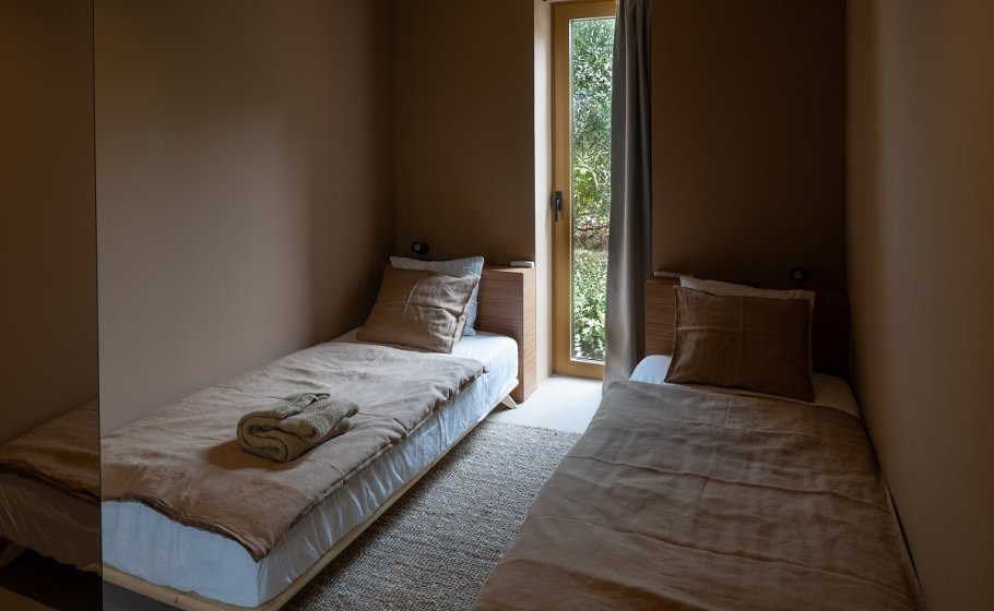 The four main bedrooms are identical in size, each offering panoramic sea views through French windows. Each room has two single beds that can be separated or combined into a large double bed, and each features walk-in showers with dual basins. The fifth bedroom also has two single beds and can be used independently or as part of a family suite, with its own standalone bathroom featuring a bathtub and an outdoor al fresco shower.