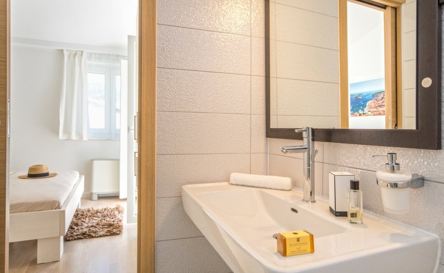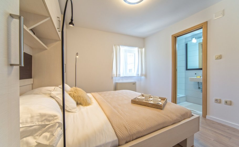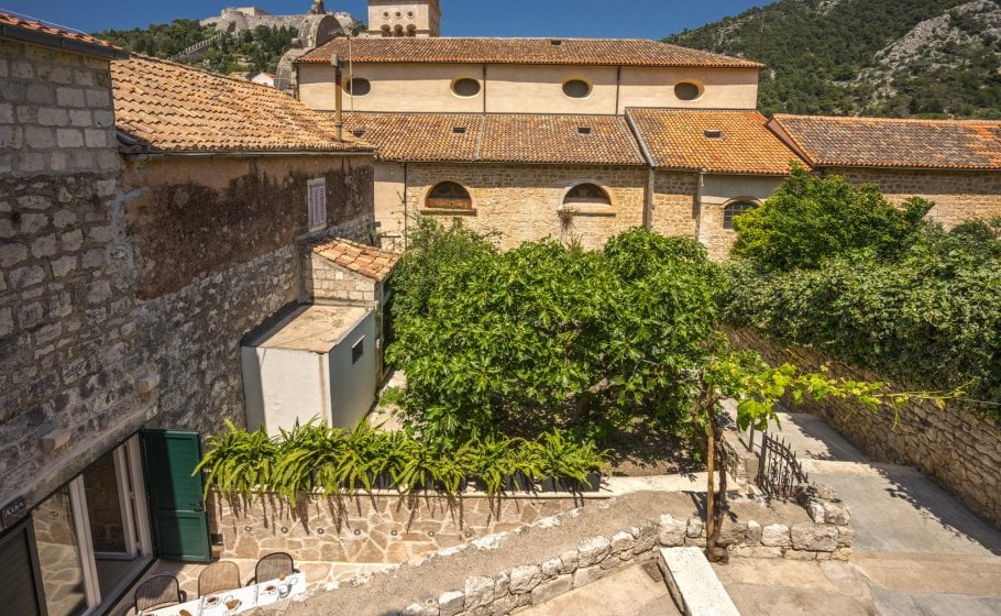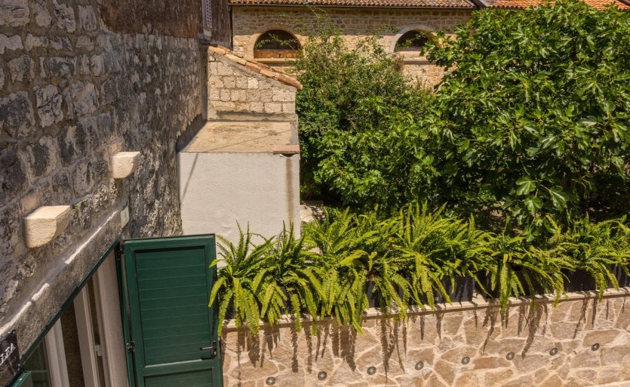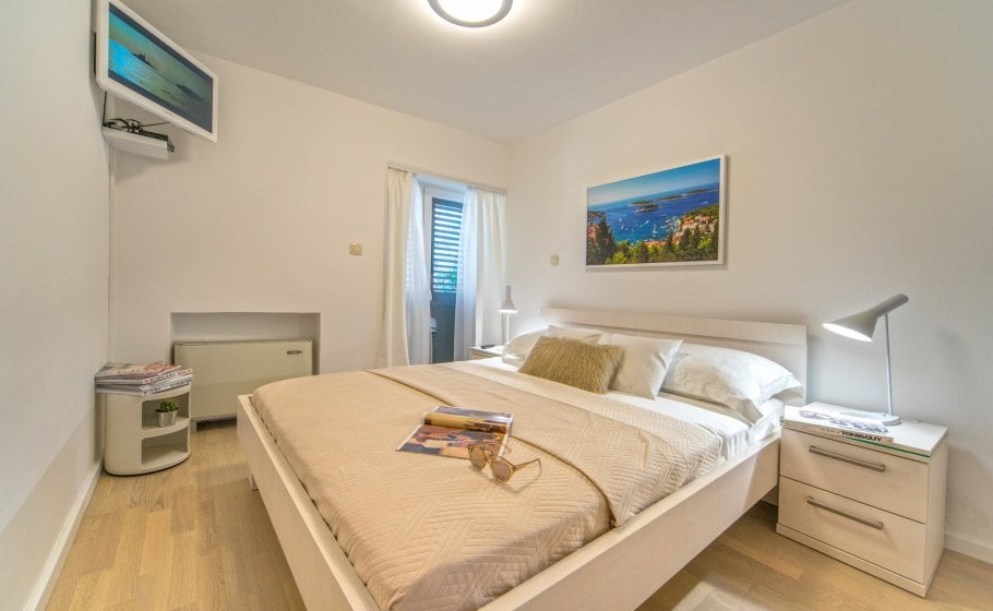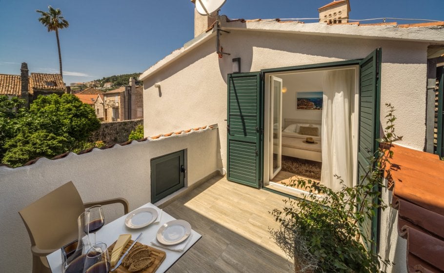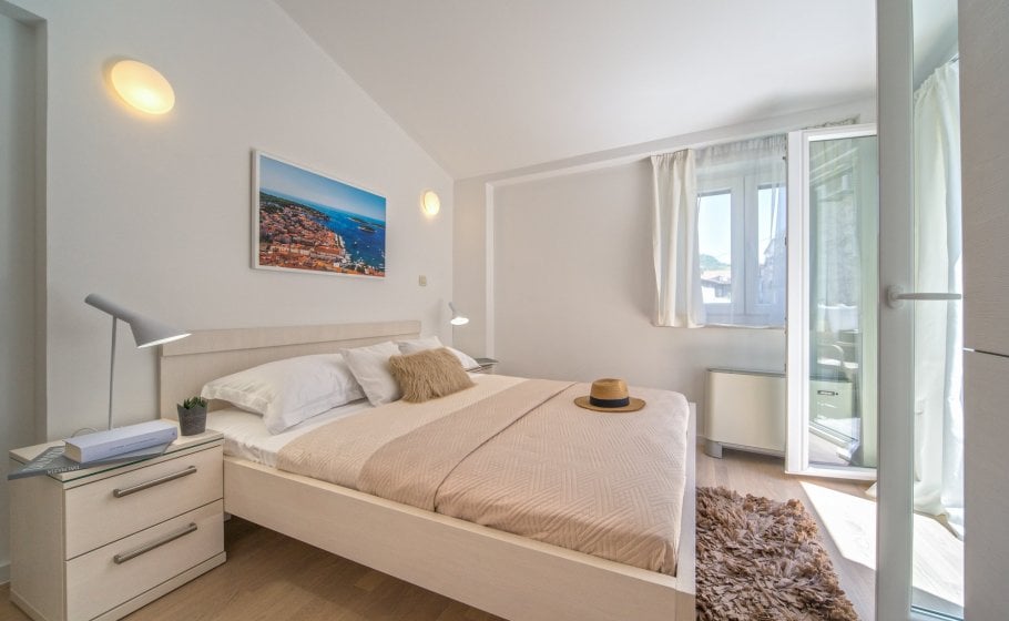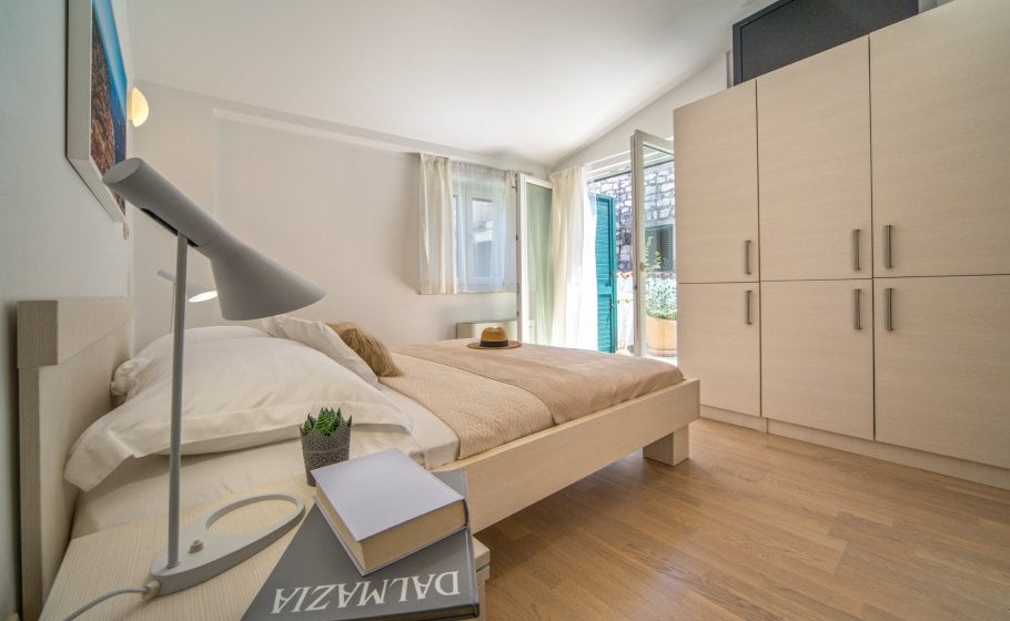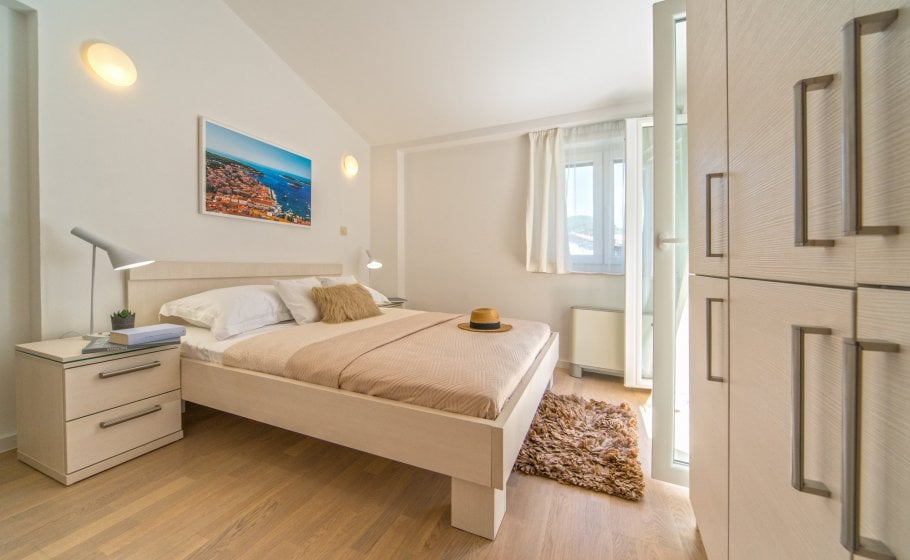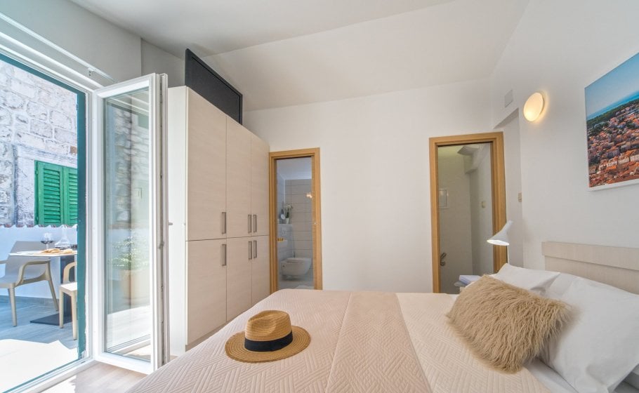 Ten steps lead you from the first to the second floor, that is, to the attic. There you’ll find a double-bed master bedroom with an en-suite bathroom (with a shower tray). The master bedroom has an exit to a terrace covering 7 m2. The terrace offers a view of the old town core and the roofs of neighboring houses on one side, and the cathedral and nearby hills on the other. The terrace has a deck chair, a table, and two chairs. You can also see our favorite town palm tree from there – hope other palm trees in the town of Hvar won’t mind us saying this.