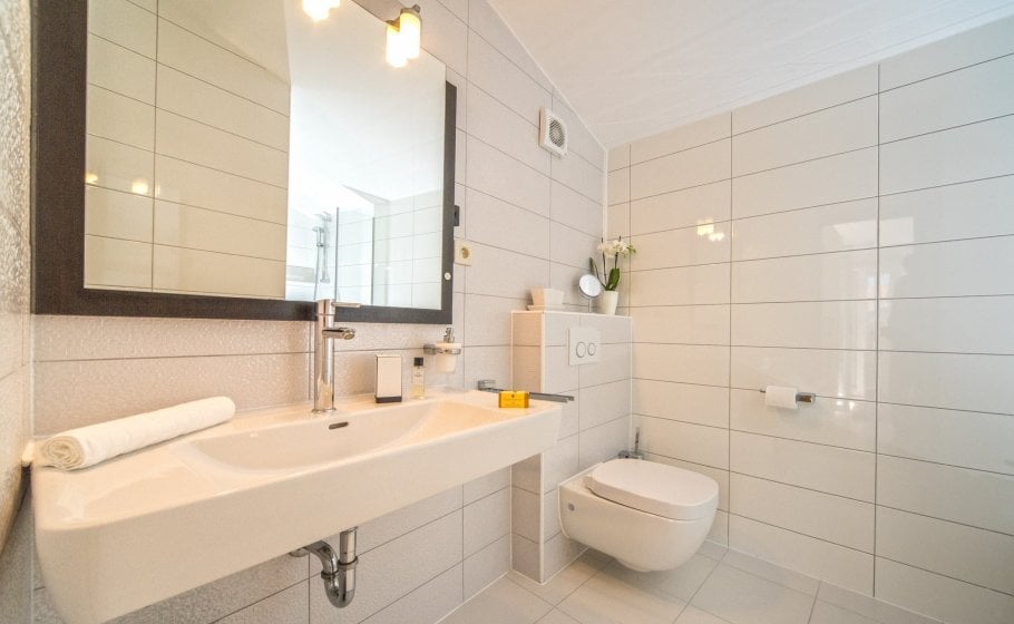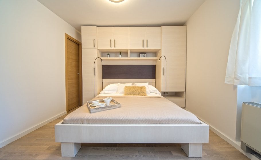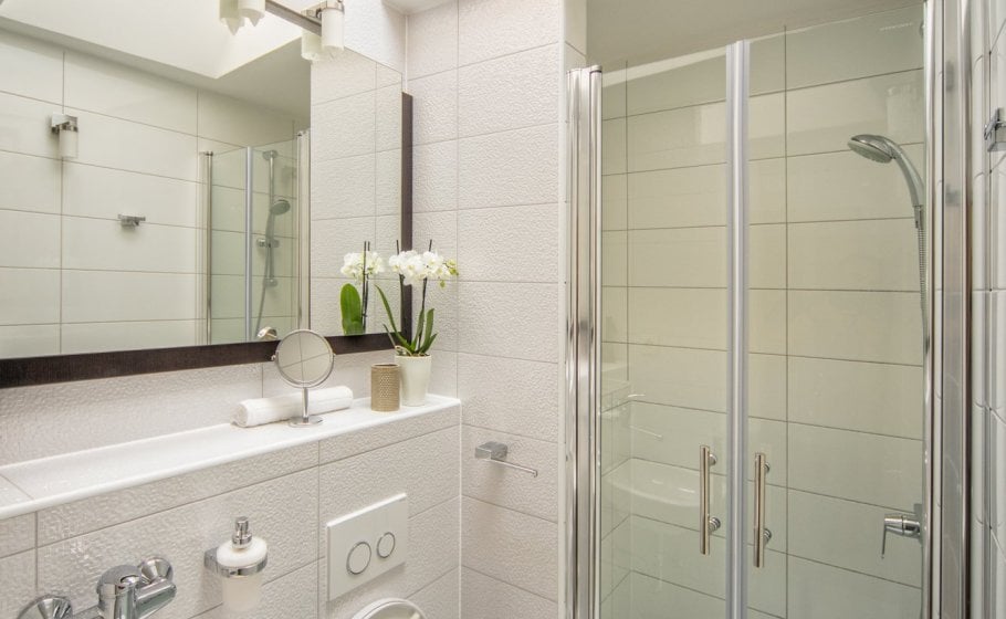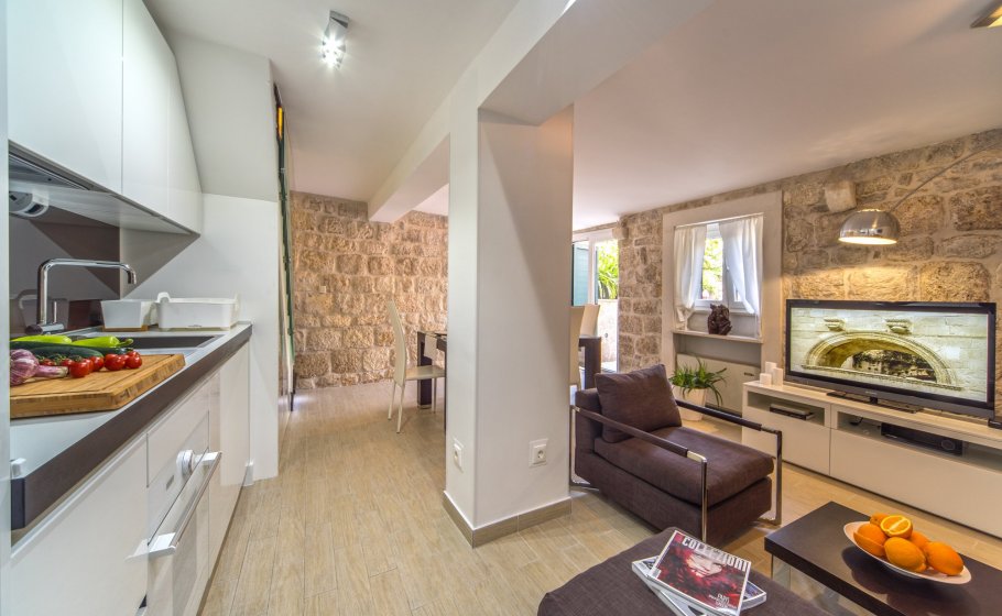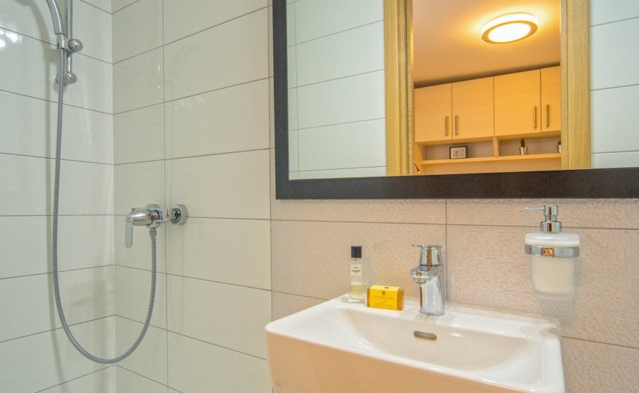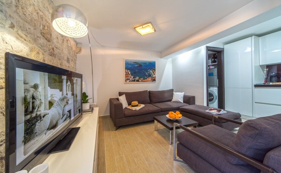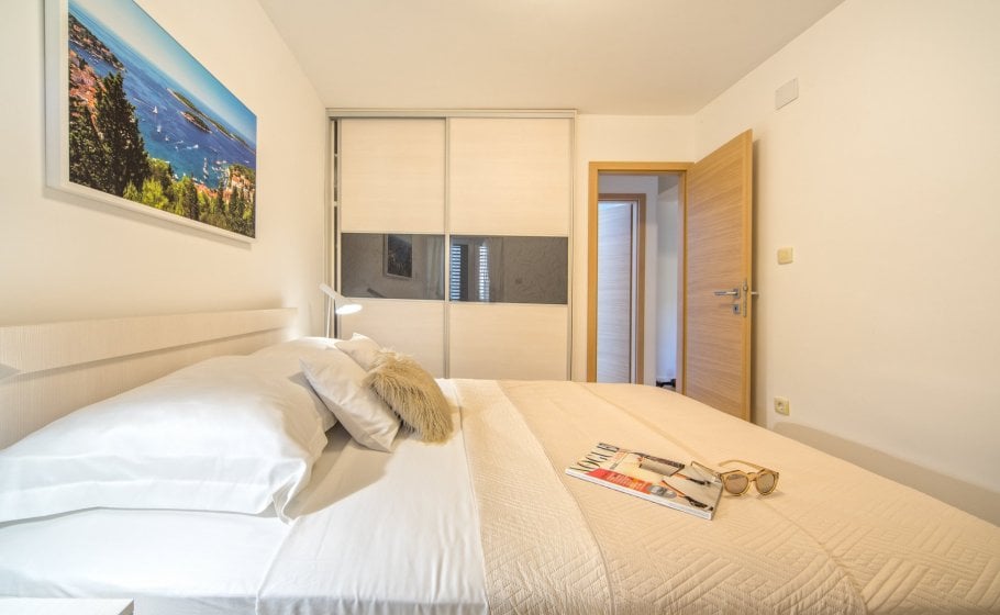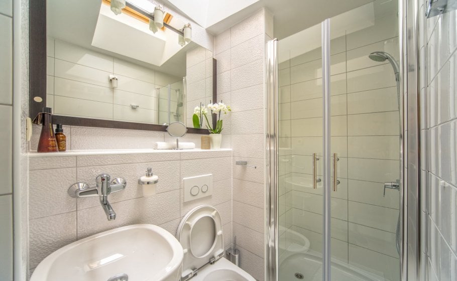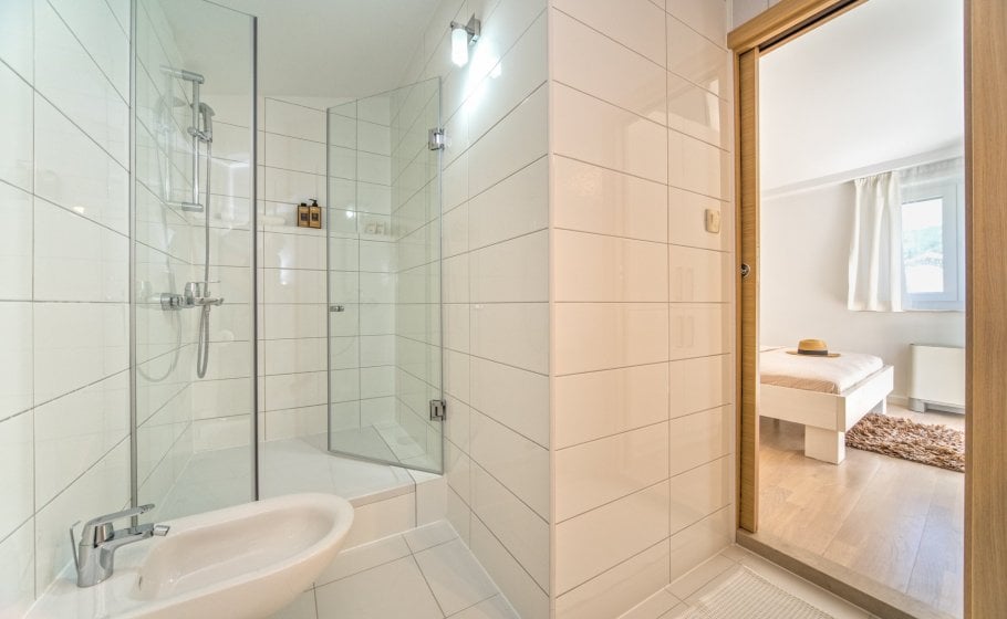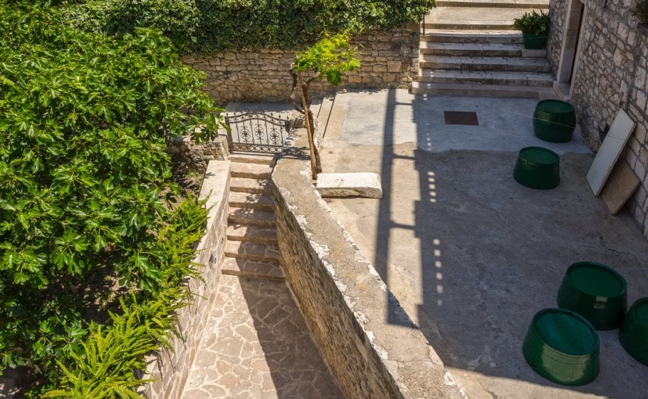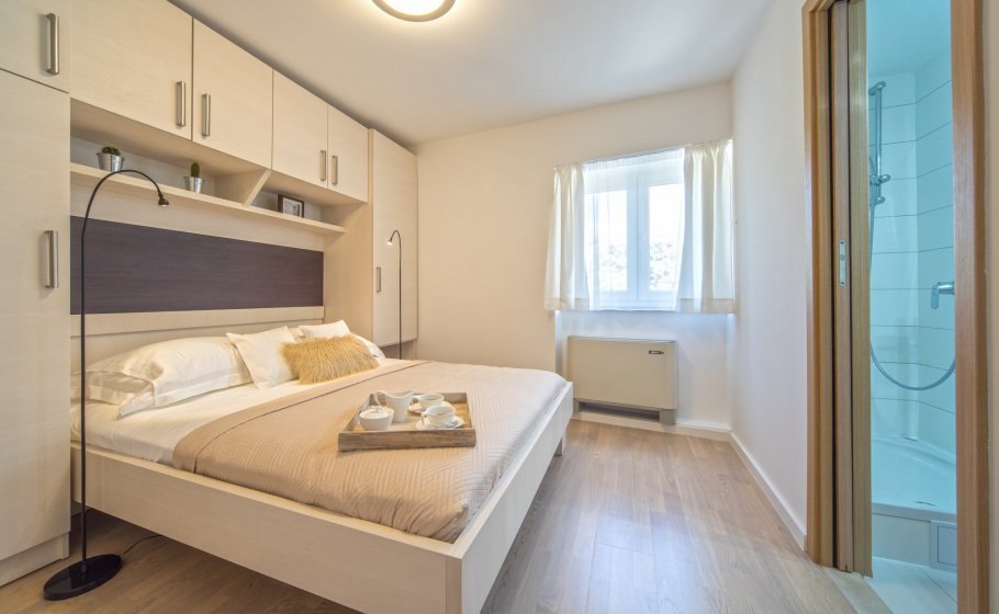 Ten steps lead you from the first to the second floor, that is, to the attic. There you’ll find a double-bed master bedroom with an en-suite bathroom (with a shower tray). The master bedroom has an exit to a terrace covering 7 m2. The terrace offers a view of the old town core and the roofs of neighboring houses on one side, and the cathedral and nearby hills on the other. The terrace has a deck chair, a table, and two chairs. You can also see our favorite town palm tree from there – hope other palm trees in the town of Hvar won’t mind us saying this.