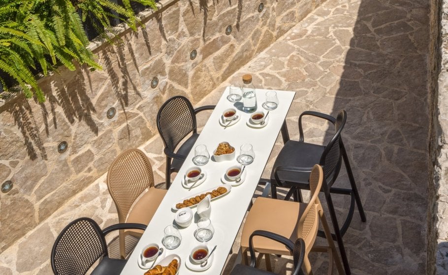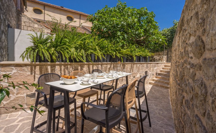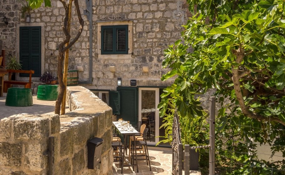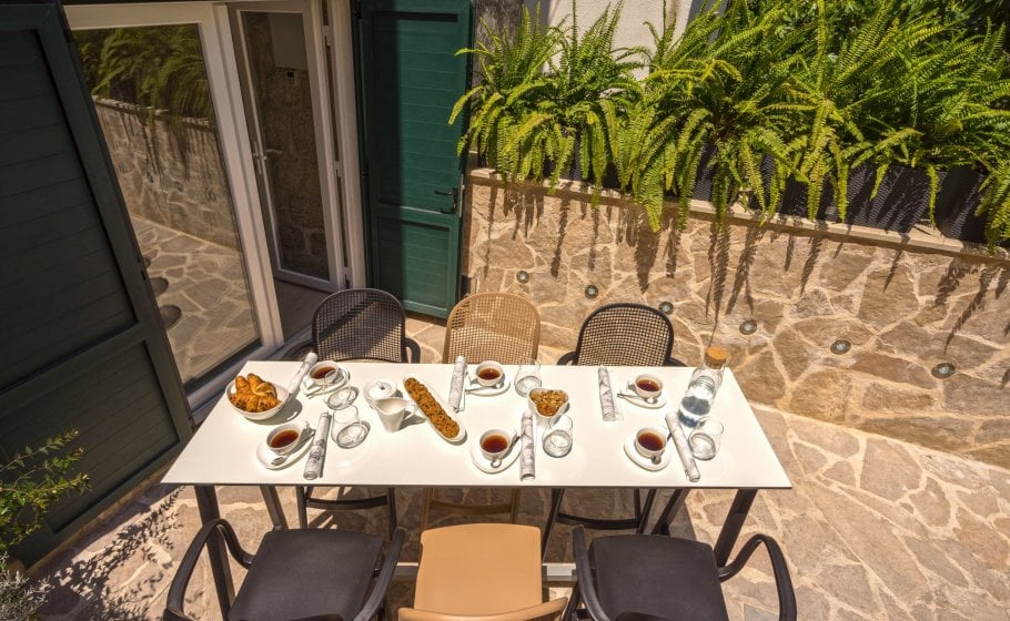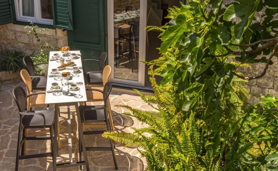 Elpis found its location in the old town core, in an old stone semi-detached house more than 450 years old. After opening the front yard gate from the street, seven stairs take you to a long stone yard surrounded by Mediterranean foliage. In the yard, you’ll find a high table with six chairs.