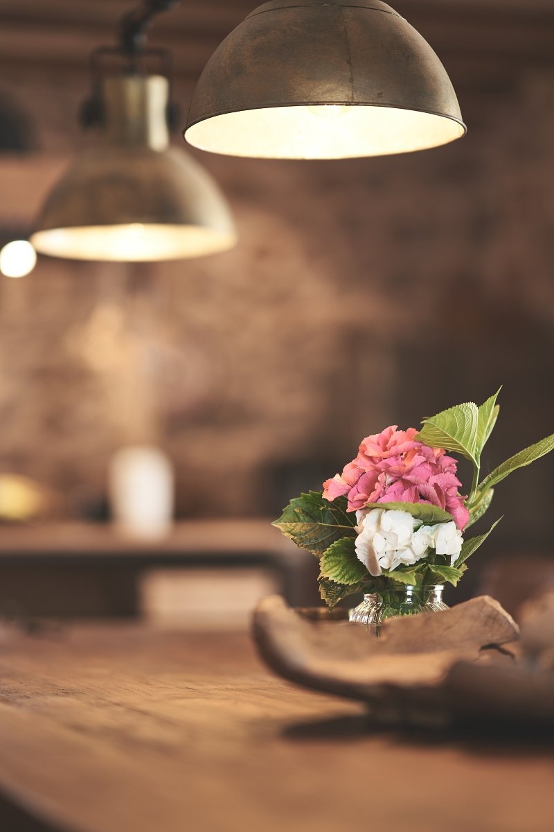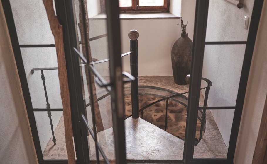 A wooden mosaic and terrastone floor in combination with the original natural stone walls, furniture made from natural materials, hand-forged, large glass doors, and antique elements conjure up an inviting feel-good atmosphere.