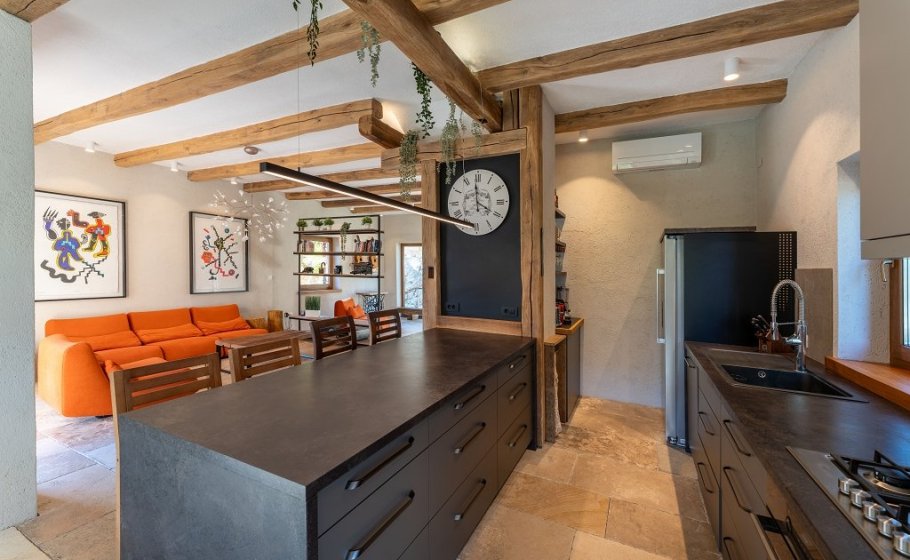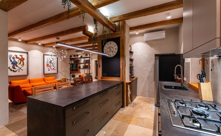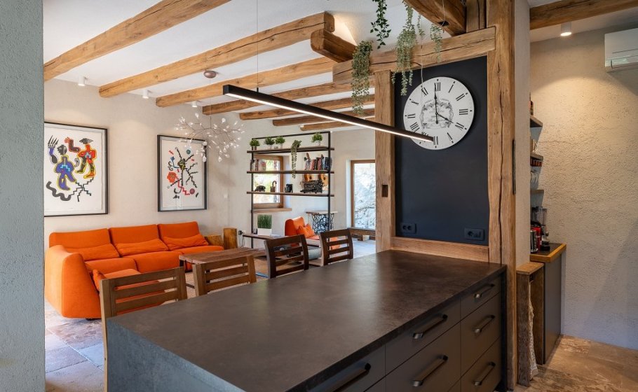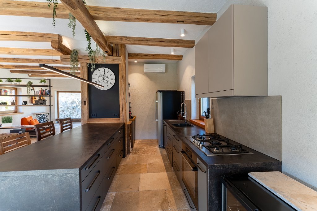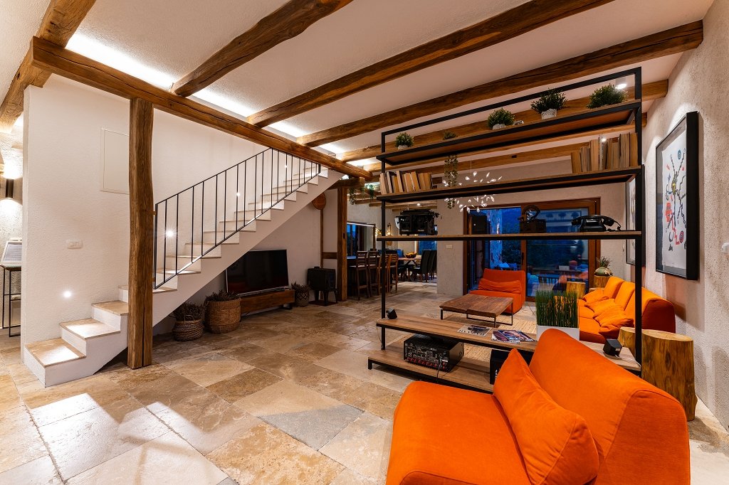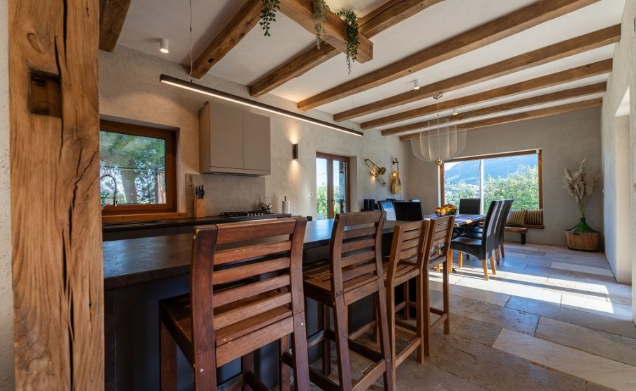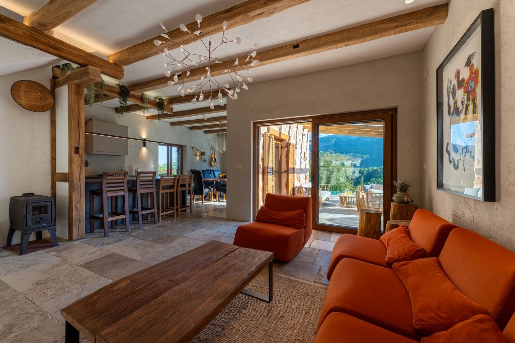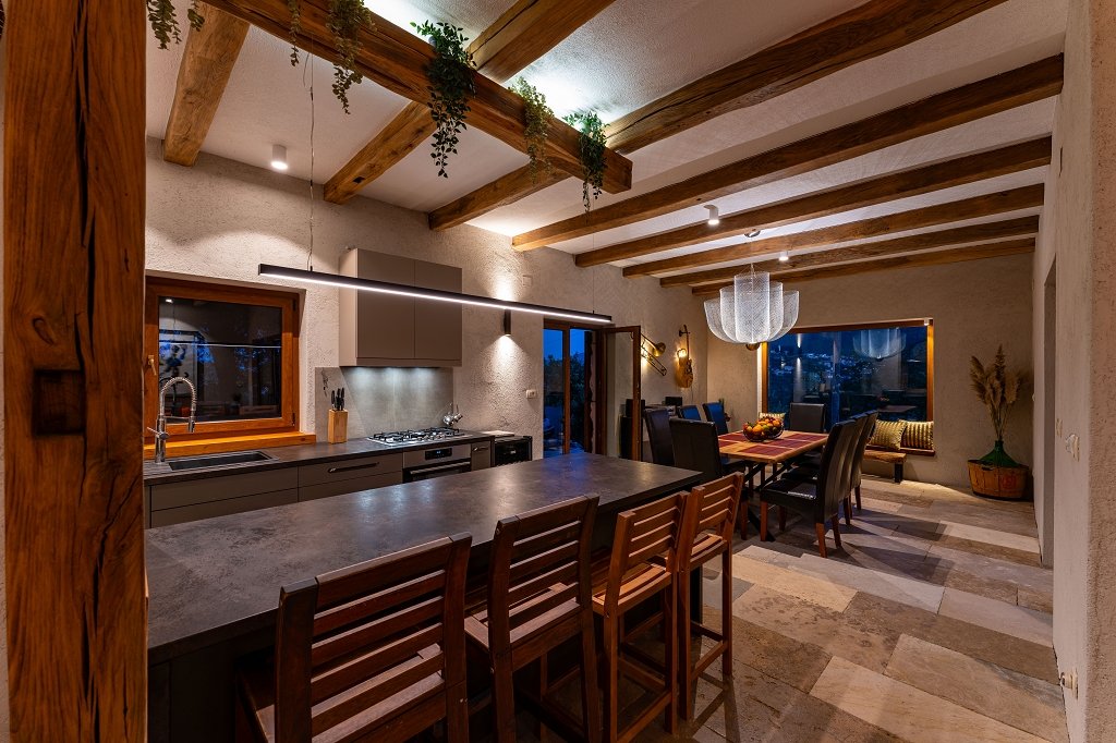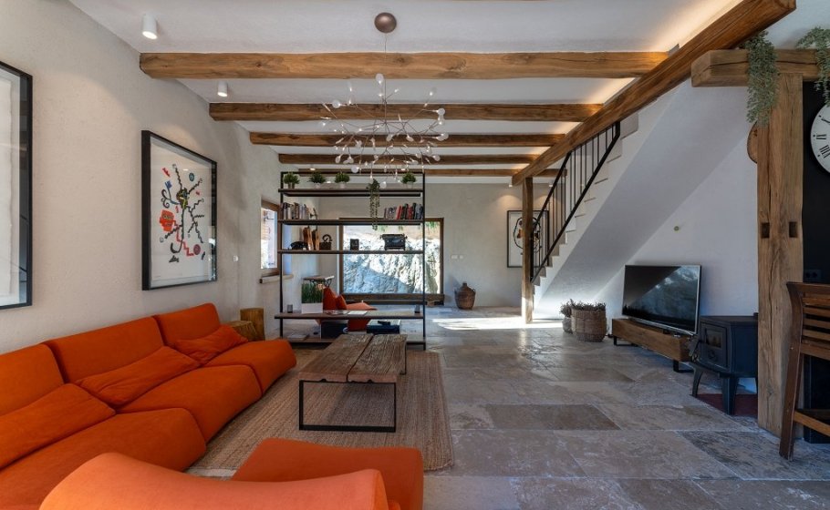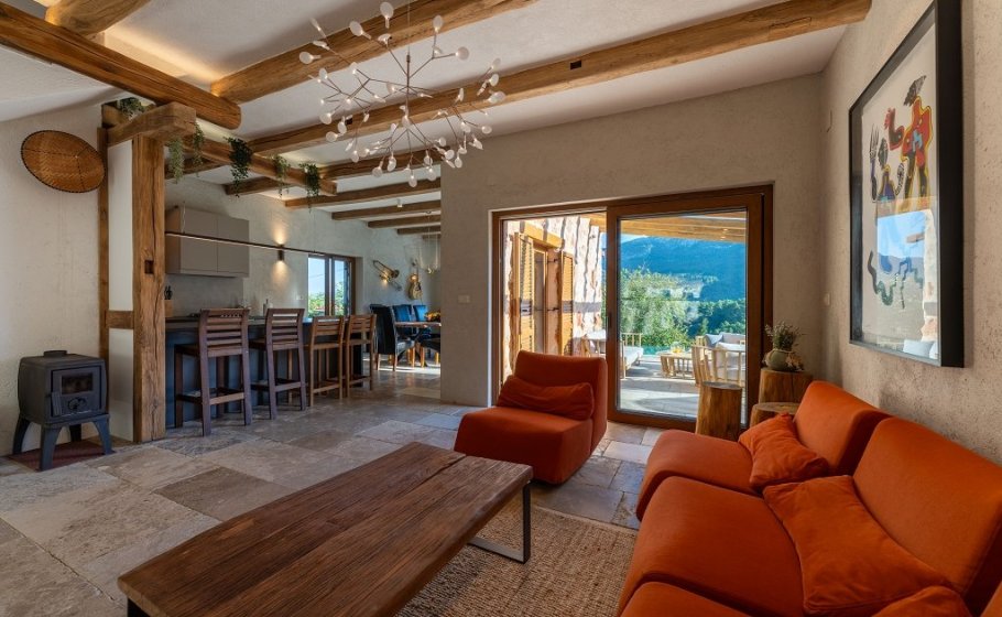 The open-plan living area on the ground floor is spacious, stylish, and full of character. Soaring oak-beamed ceilings, natural stone flooring, and raw concrete walls create a refined, contemporary feel. Handmade wooden furniture and bespoke cabinetry add warmth and texture throughout.