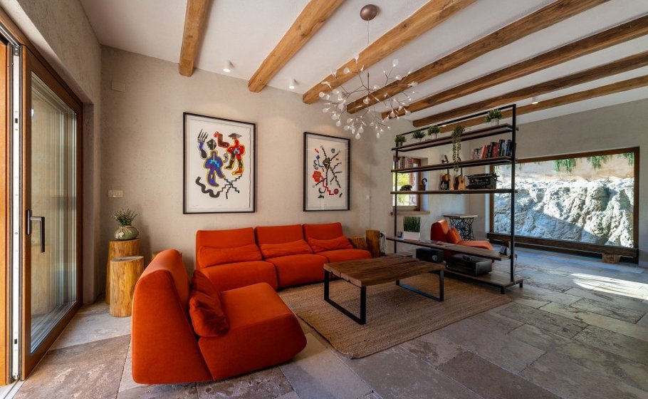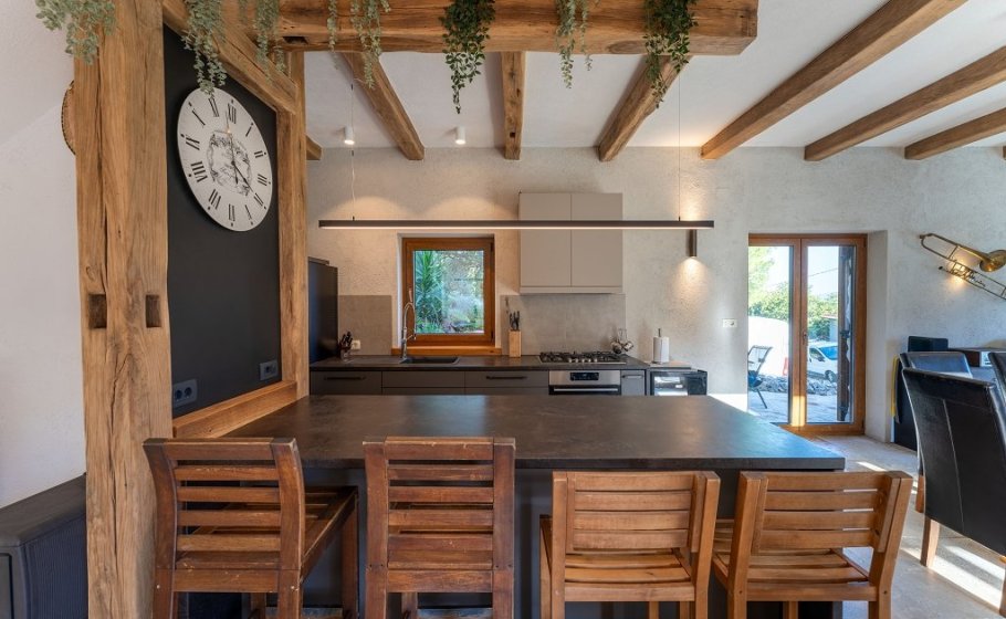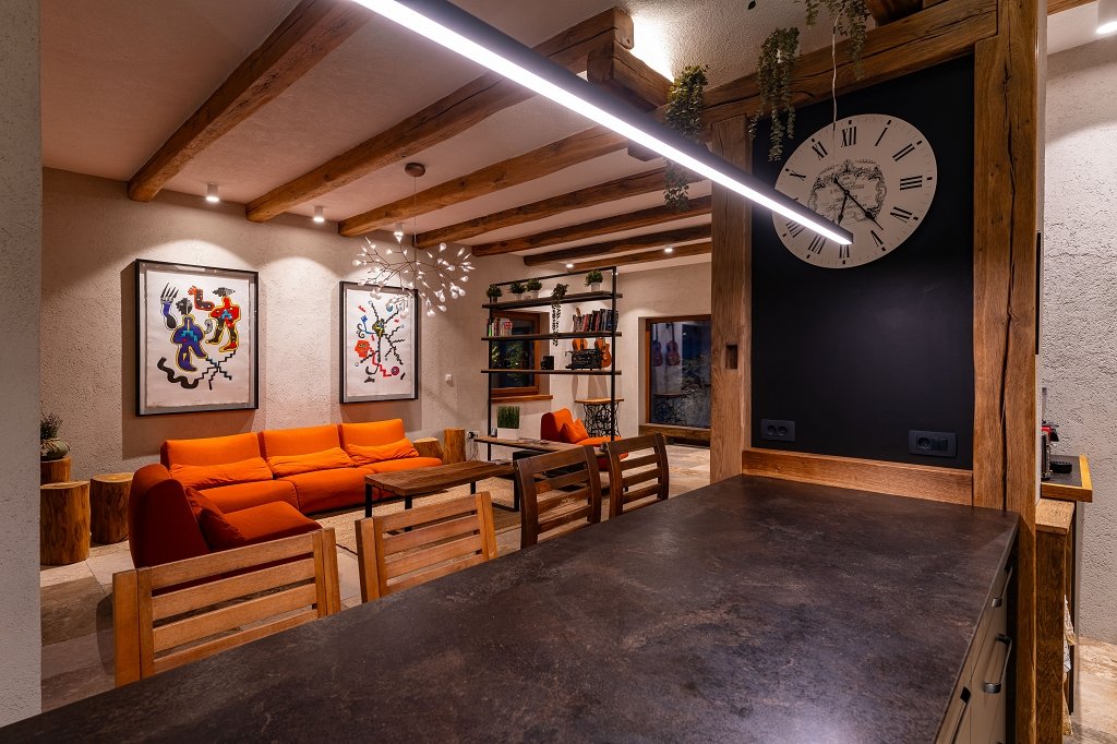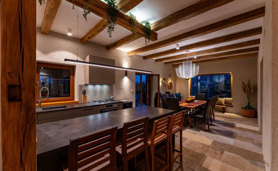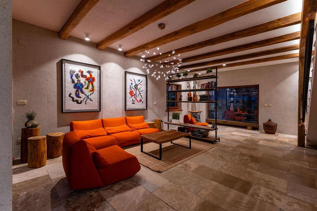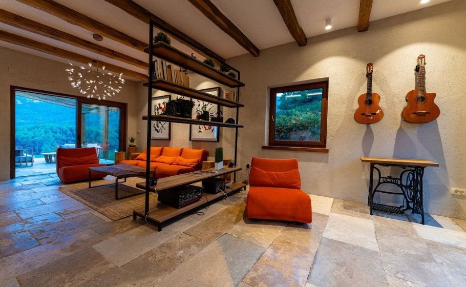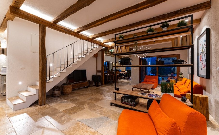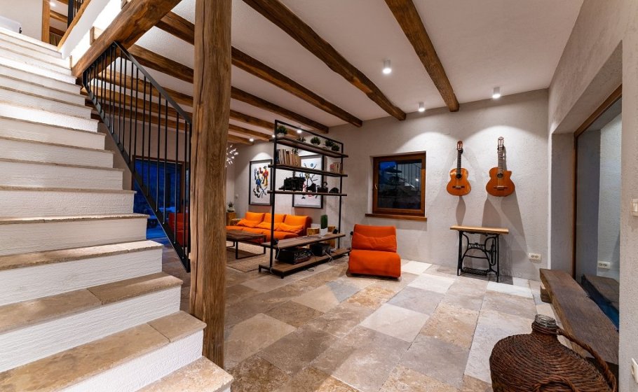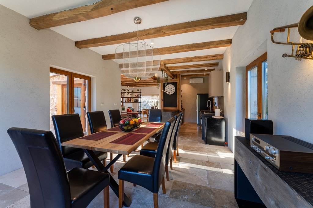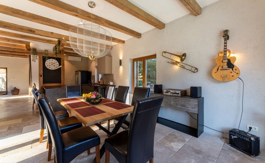 The open-plan living area on the ground floor is spacious, stylish, and full of character. Soaring oak-beamed ceilings, natural stone flooring, and raw concrete walls create a refined, contemporary feel. Handmade wooden furniture and bespoke cabinetry add warmth and texture throughout.