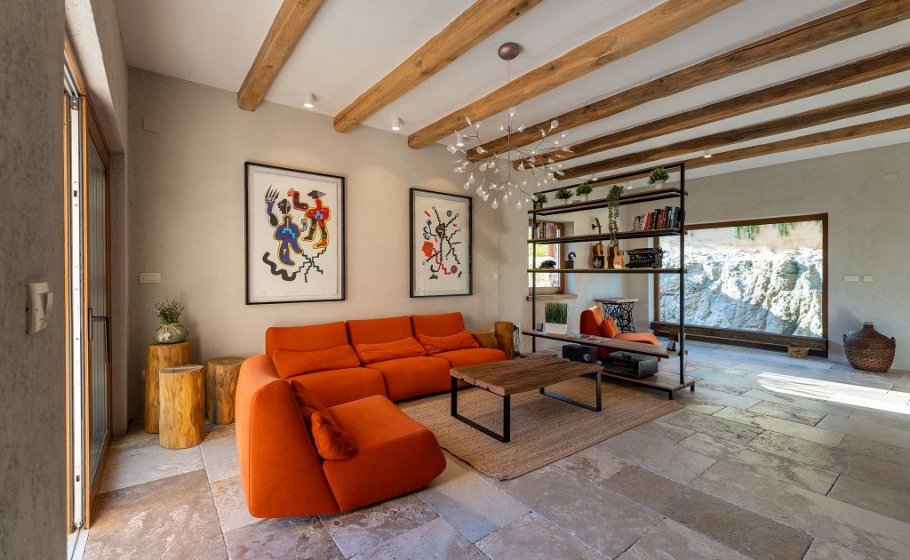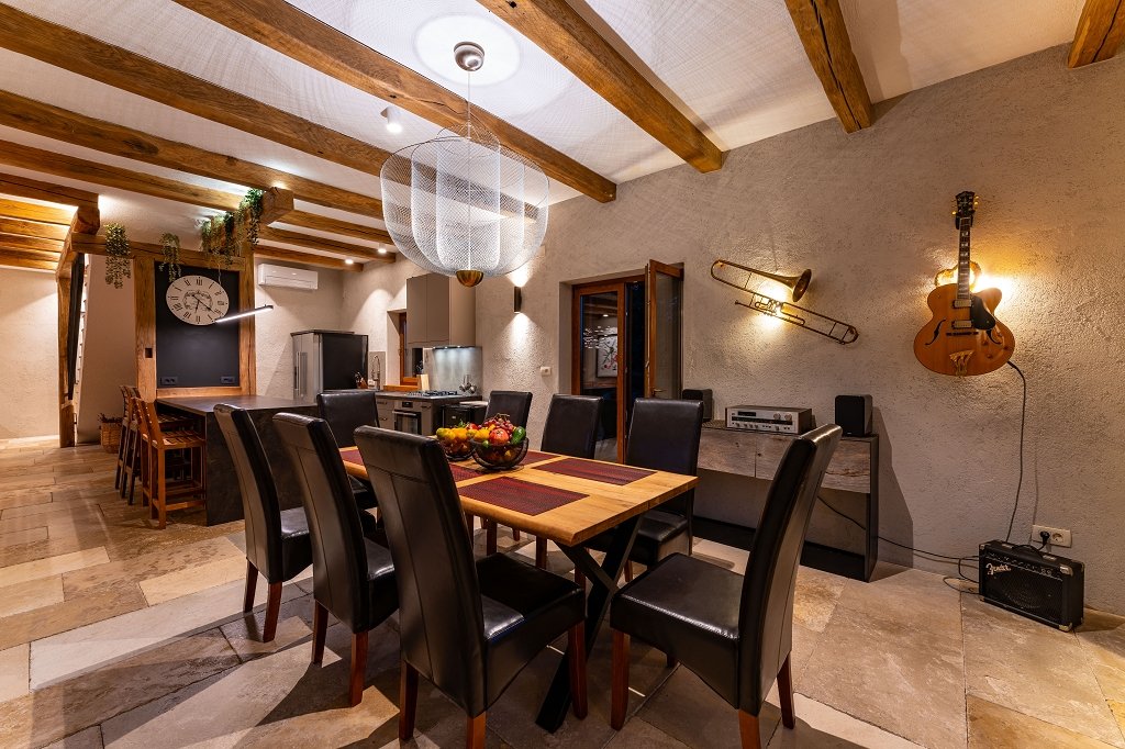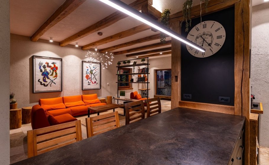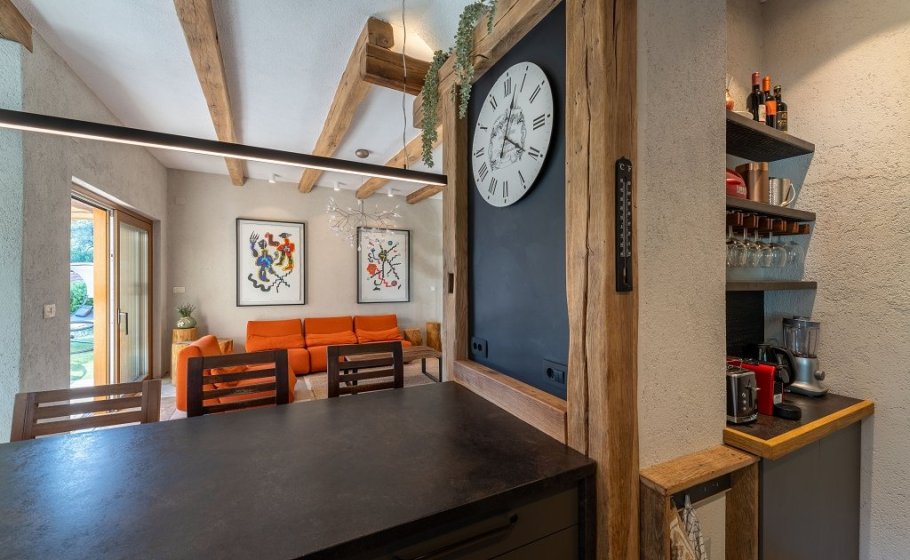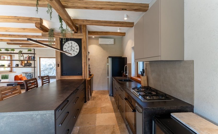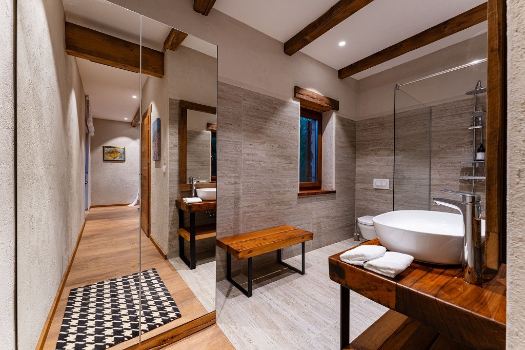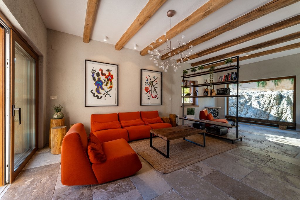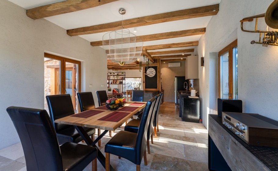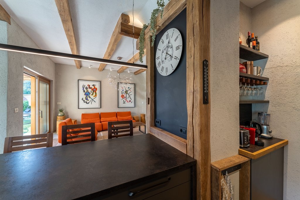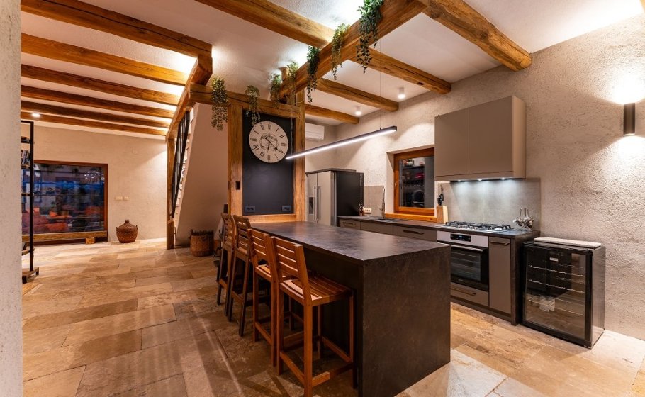 The open-plan living area on the ground floor is spacious, stylish, and full of character. Soaring oak-beamed ceilings, natural stone flooring, and raw concrete walls create a refined, contemporary feel. Handmade wooden furniture and bespoke cabinetry add warmth and texture throughout.