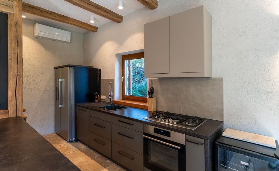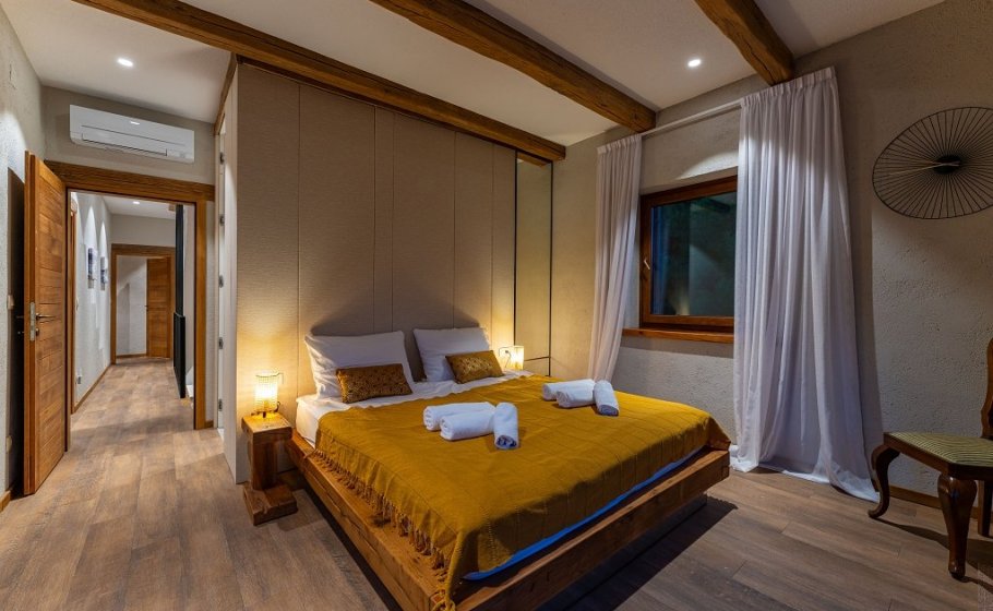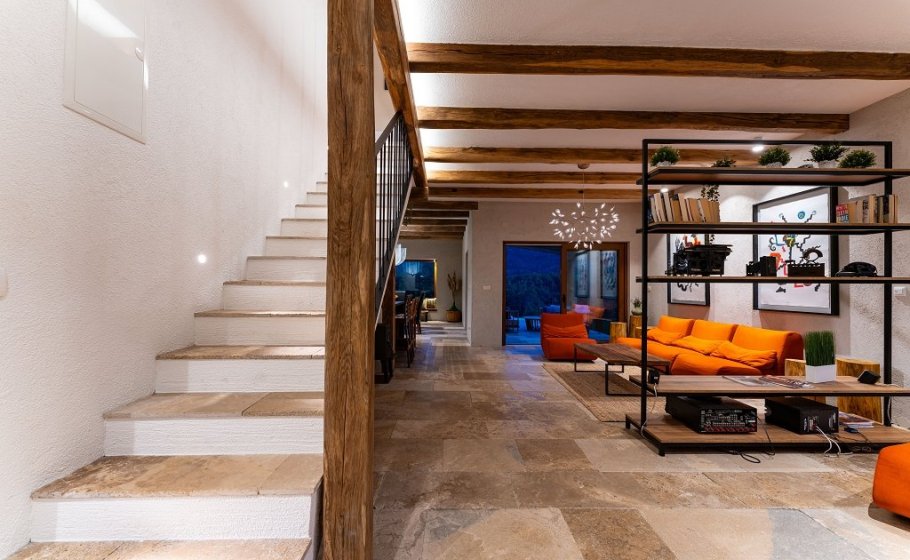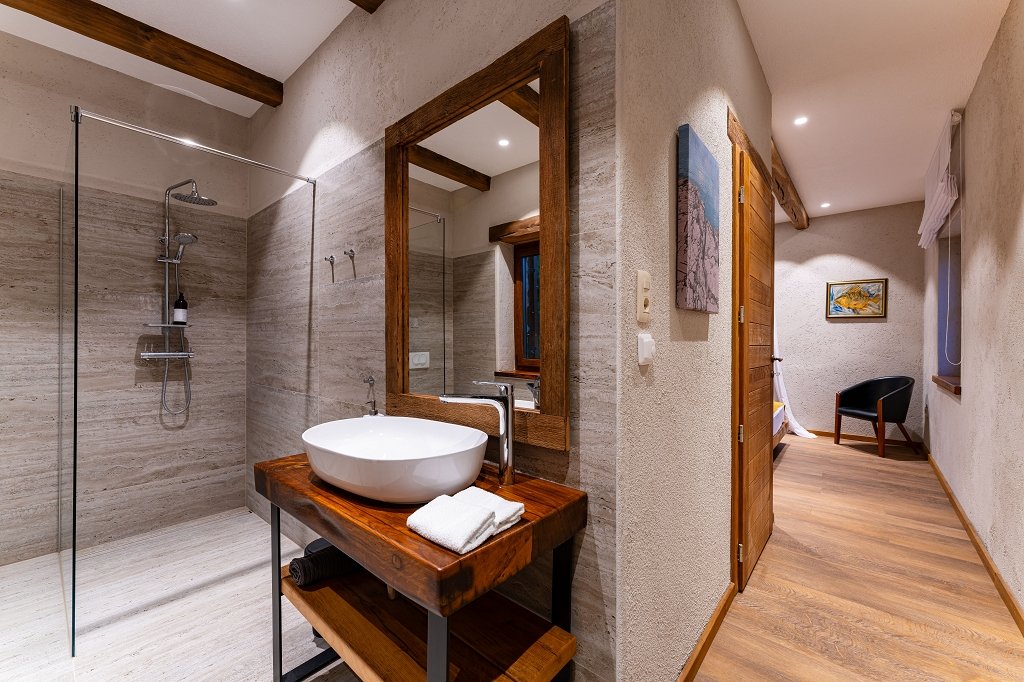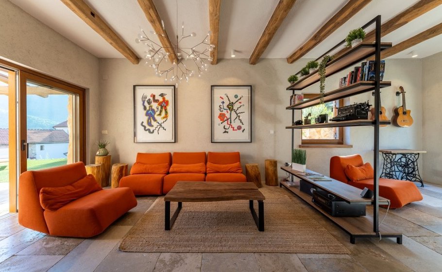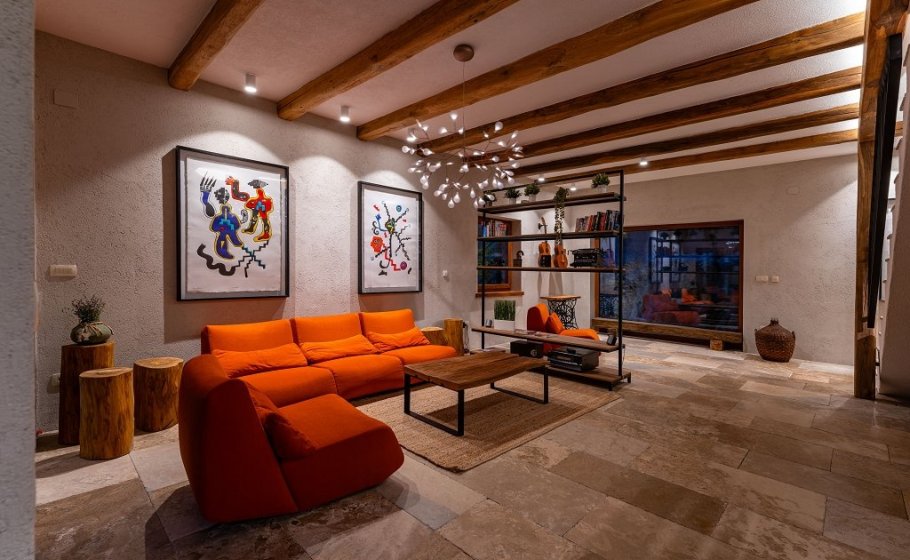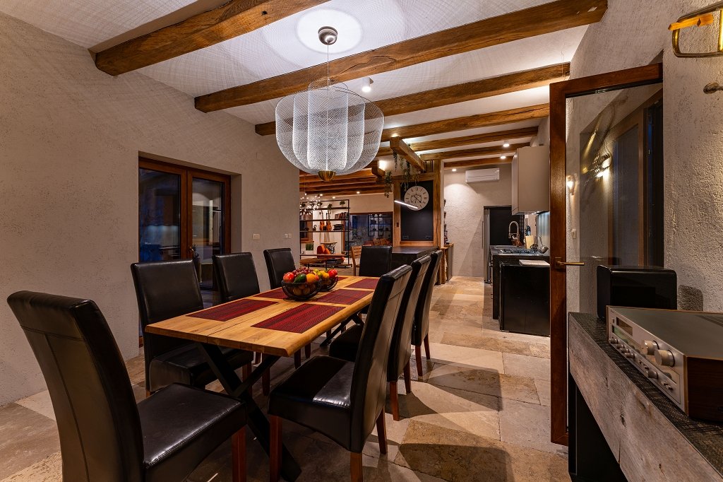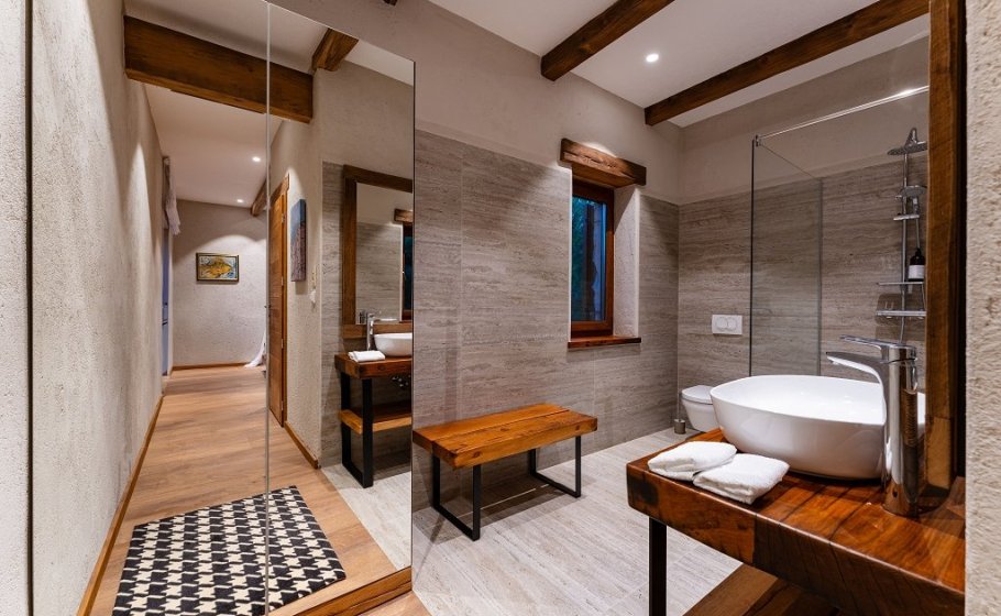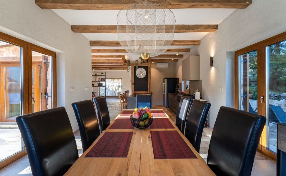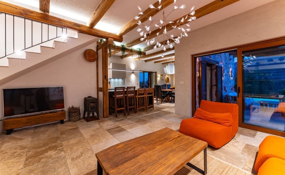 The open-plan living area on the ground floor is spacious, stylish, and full of character. Soaring oak-beamed ceilings, natural stone flooring, and raw concrete walls create a refined, contemporary feel. Handmade wooden furniture and bespoke cabinetry add warmth and texture throughout.