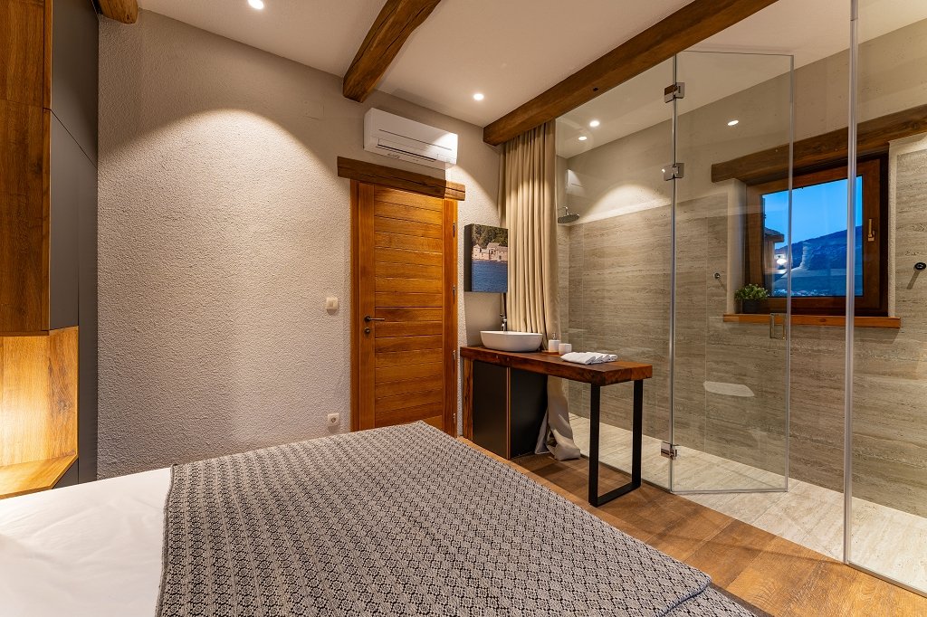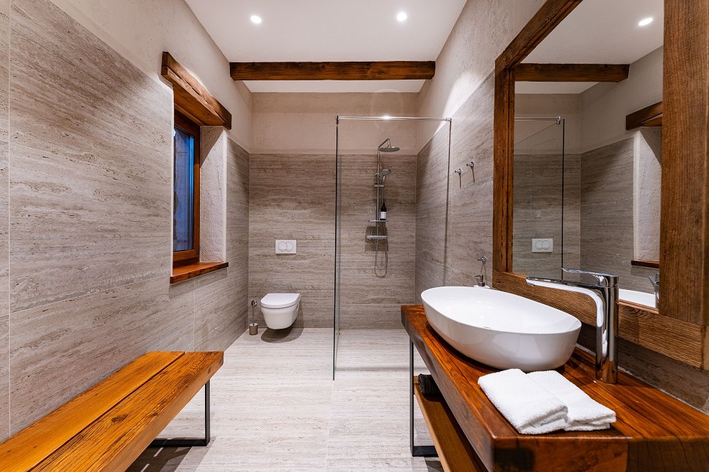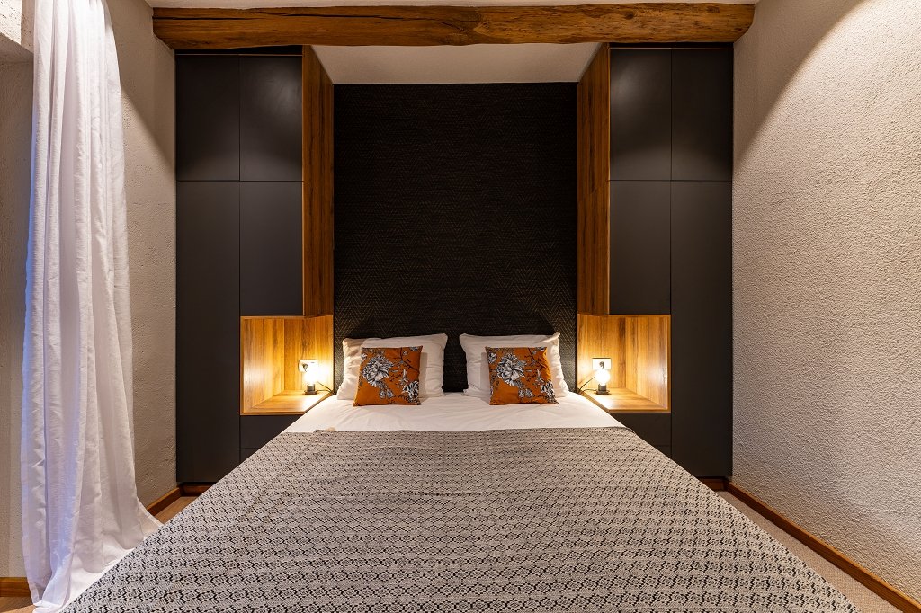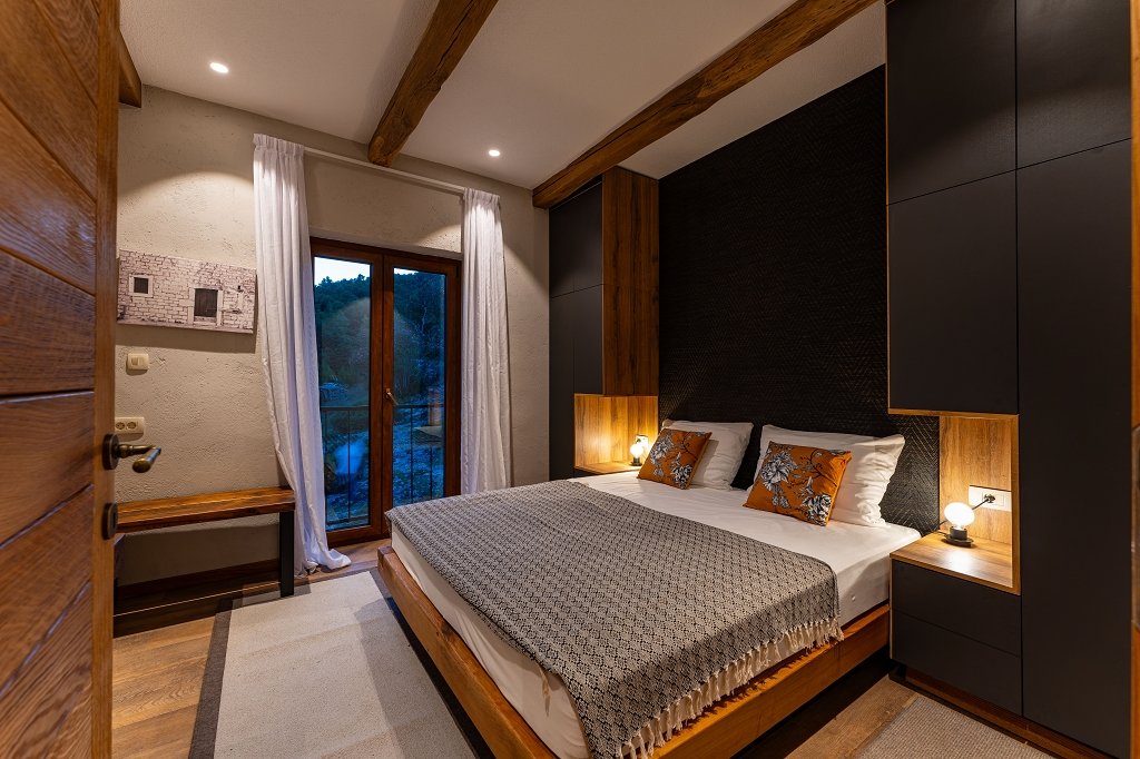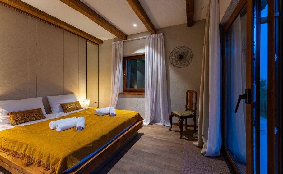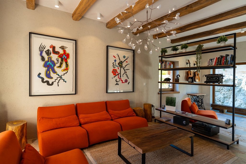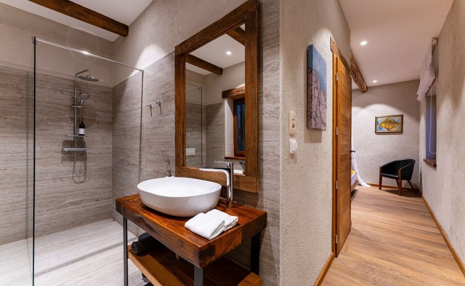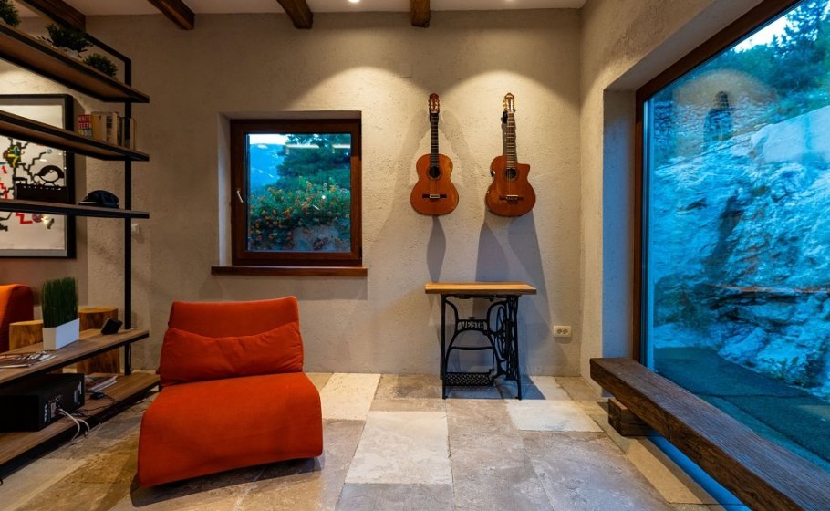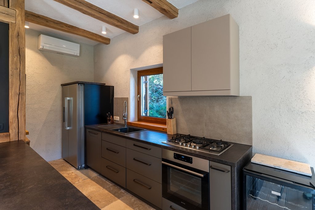 The open-plan living area on the ground floor is spacious, stylish, and full of character. Soaring oak-beamed ceilings, natural stone flooring, and raw concrete walls create a refined, contemporary feel. Handmade wooden furniture and bespoke cabinetry add warmth and texture throughout.