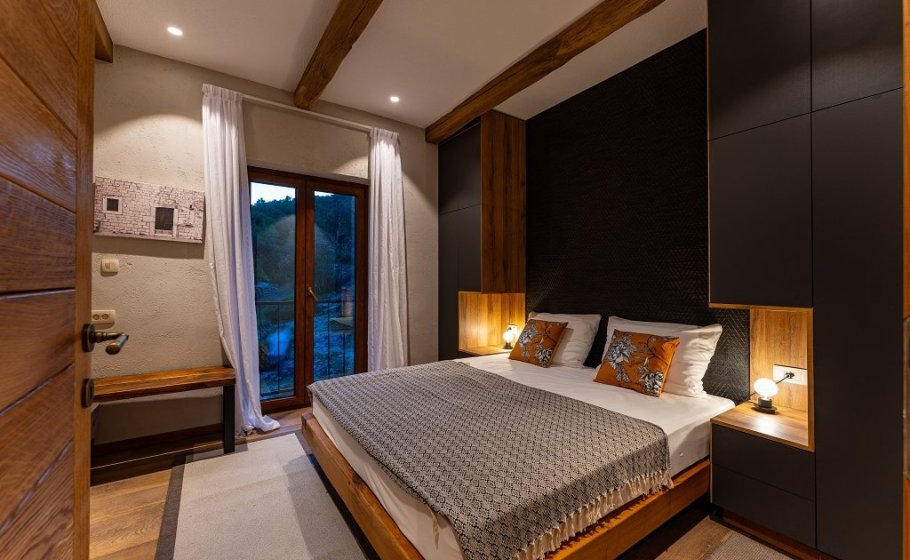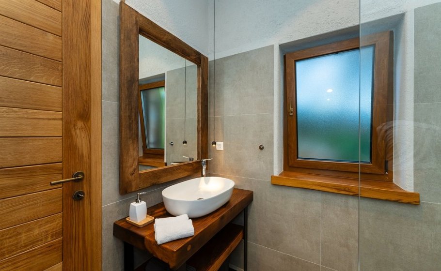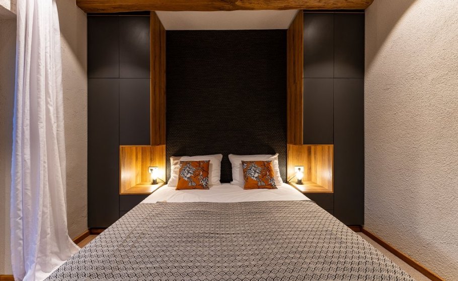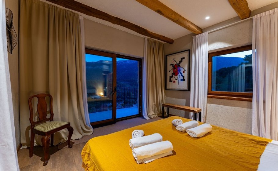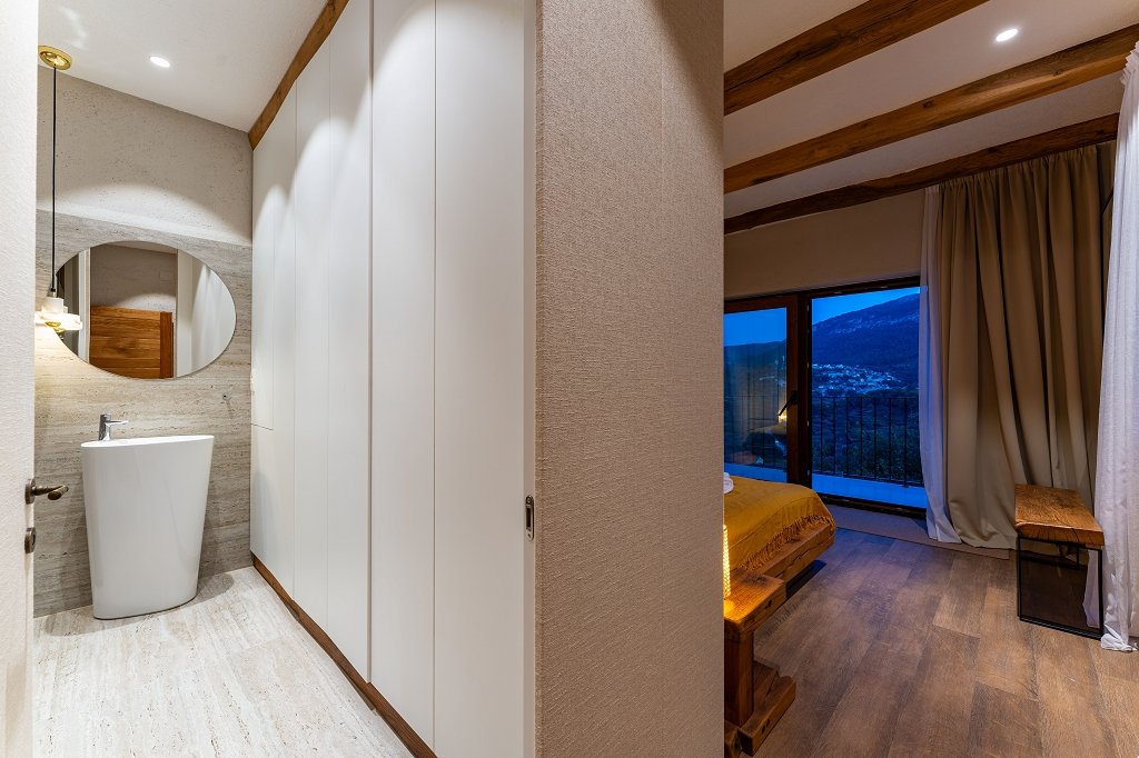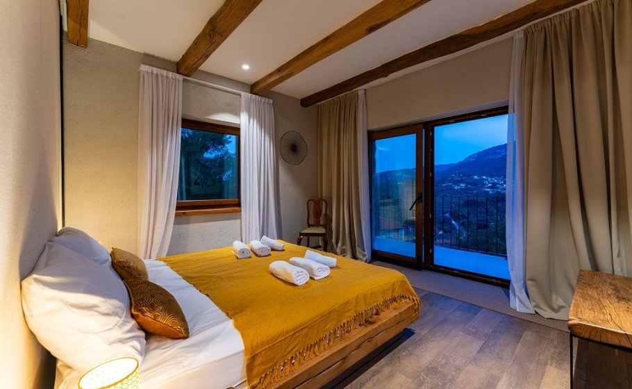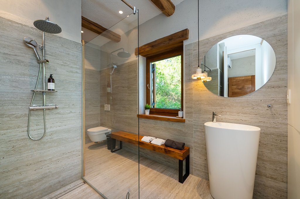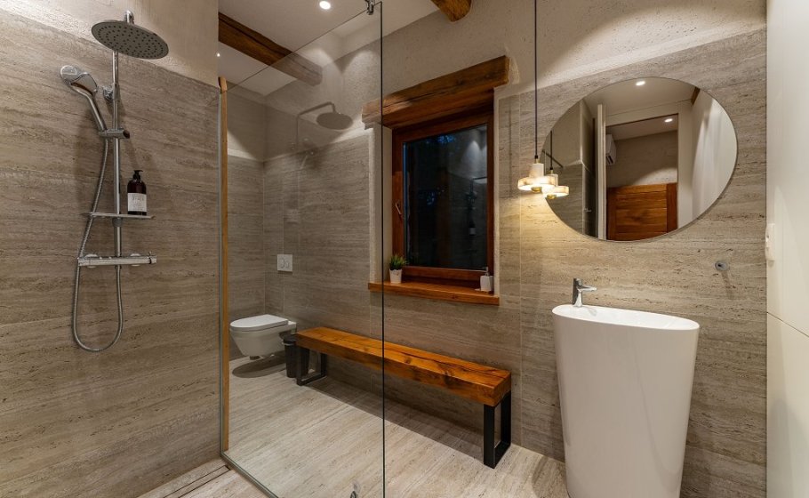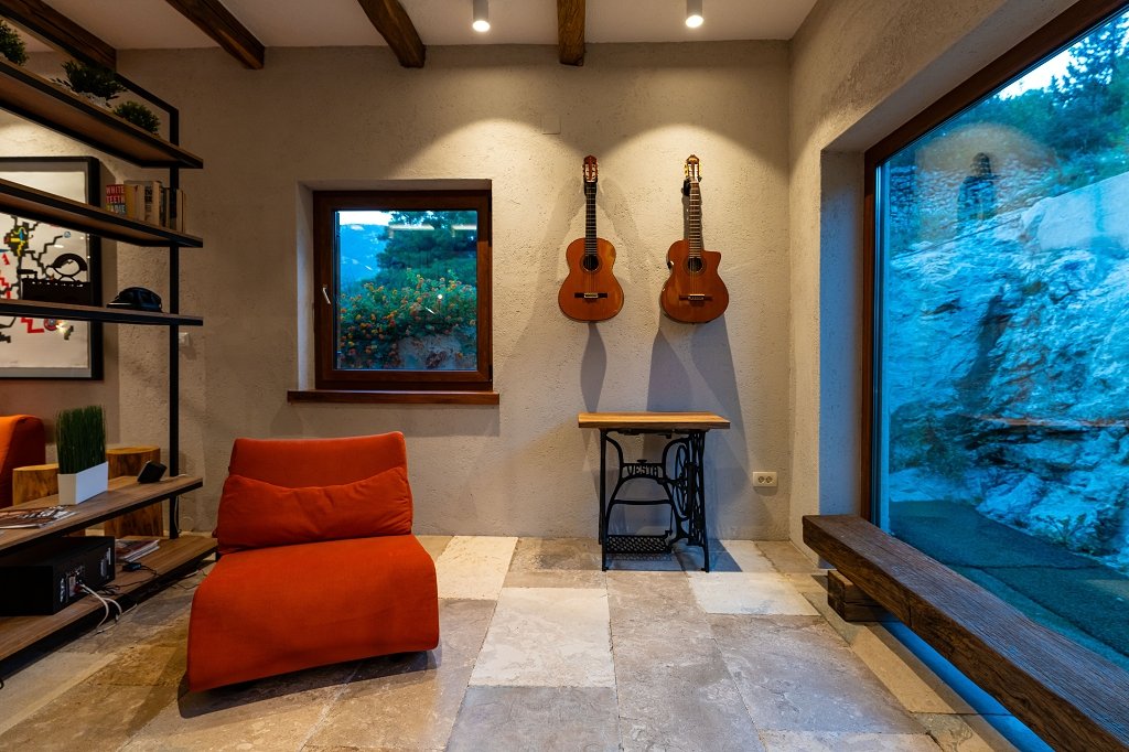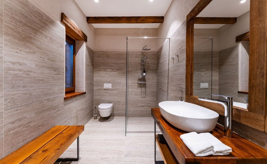 The open-plan living area on the ground floor is spacious, stylish, and full of character. Soaring oak-beamed ceilings, natural stone flooring, and raw concrete walls create a refined, contemporary feel. Handmade wooden furniture and bespoke cabinetry add warmth and texture throughout.