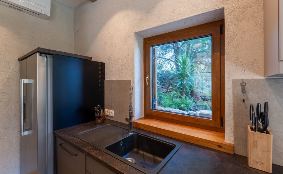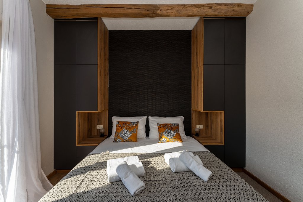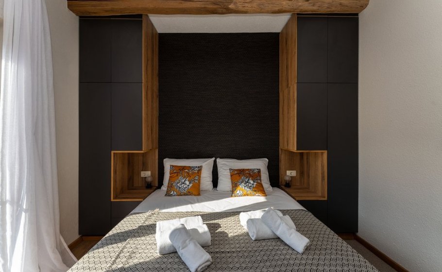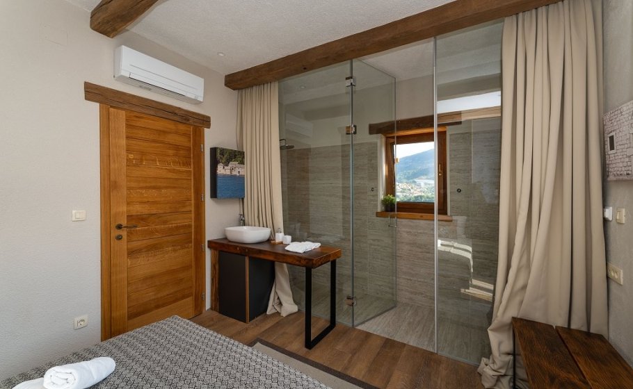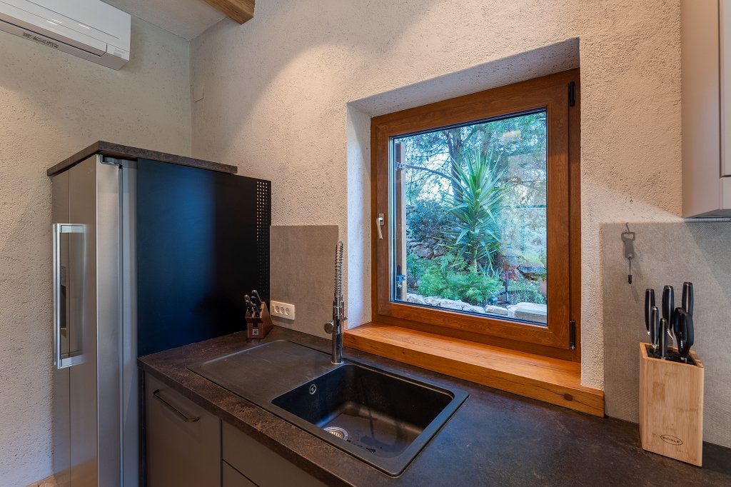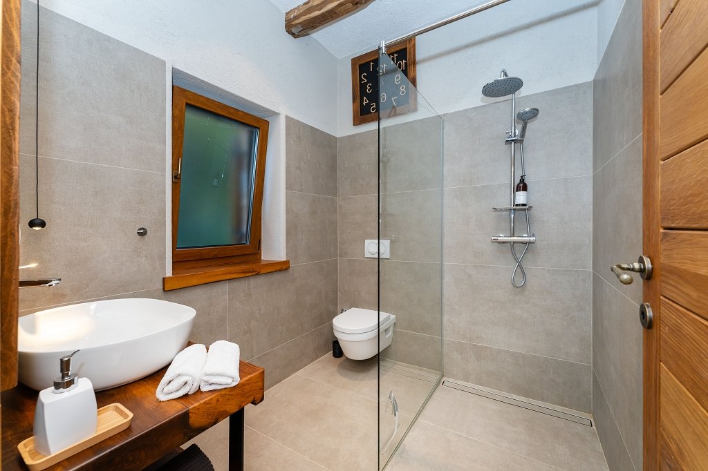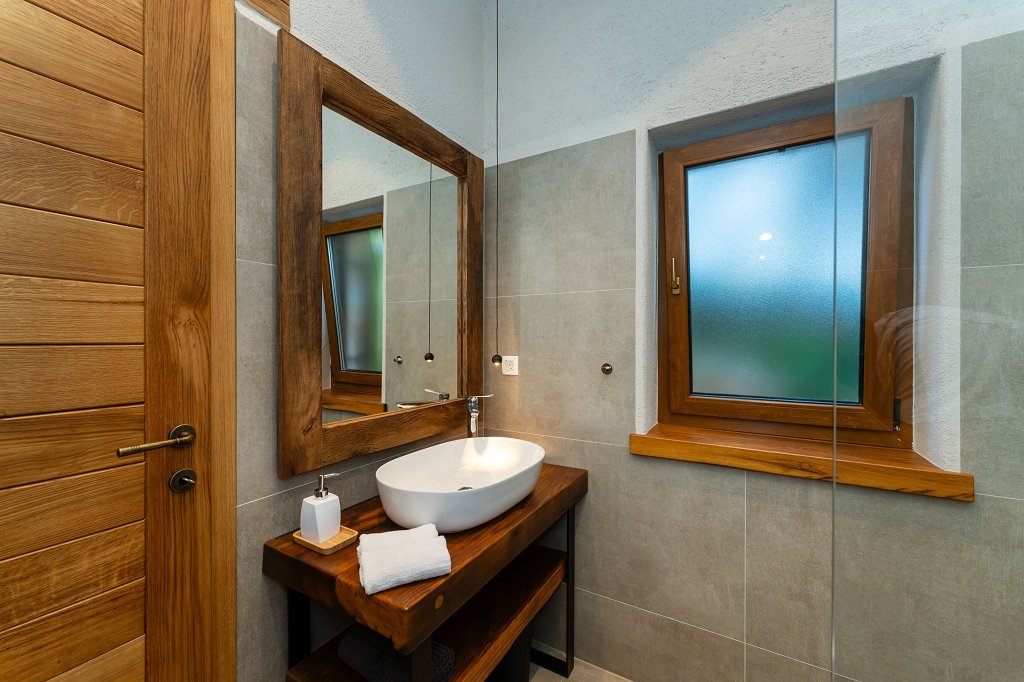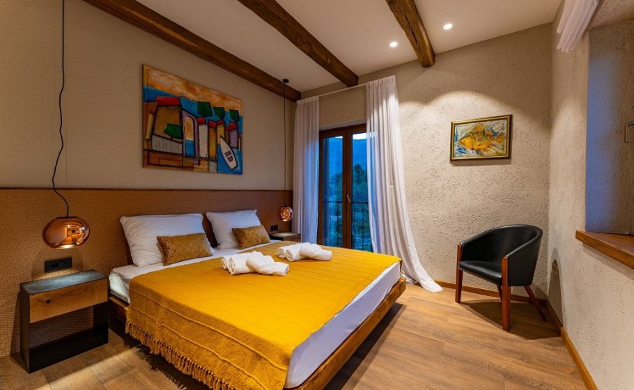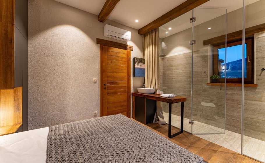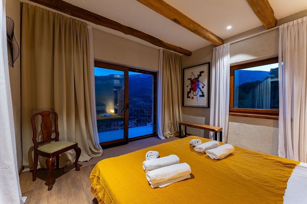 The open-plan living area on the ground floor is spacious, stylish, and full of character. Soaring oak-beamed ceilings, natural stone flooring, and raw concrete walls create a refined, contemporary feel. Handmade wooden furniture and bespoke cabinetry add warmth and texture throughout.