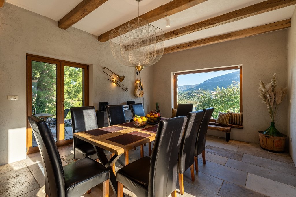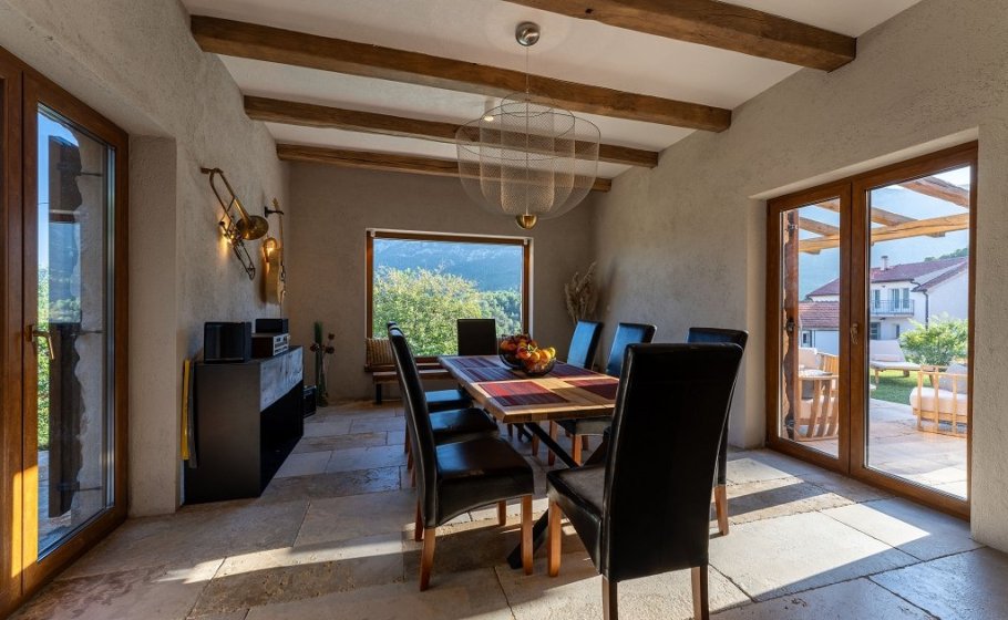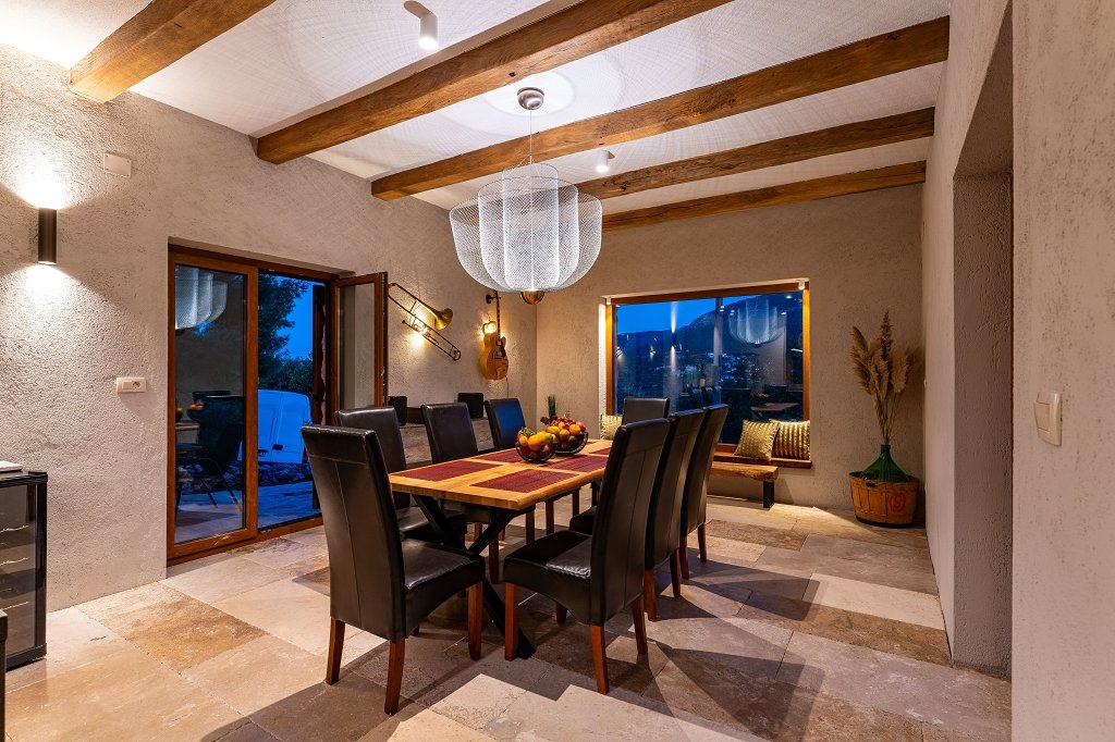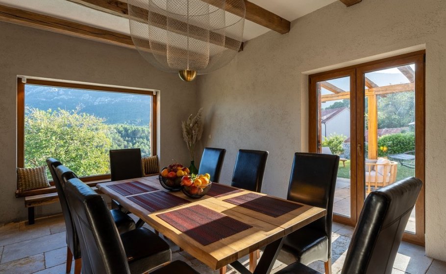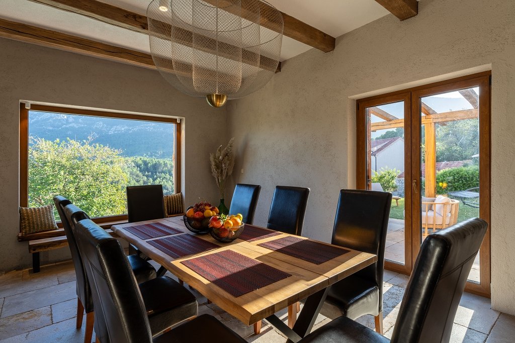 A centrally positioned dining table sits in front of a large picture window overlooking the infinity pool and the hills beyond. Between the dining and kitchen areas, a door leads out to a side terrace for easy outdoor access.