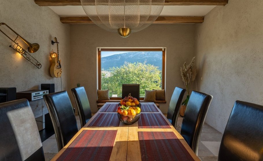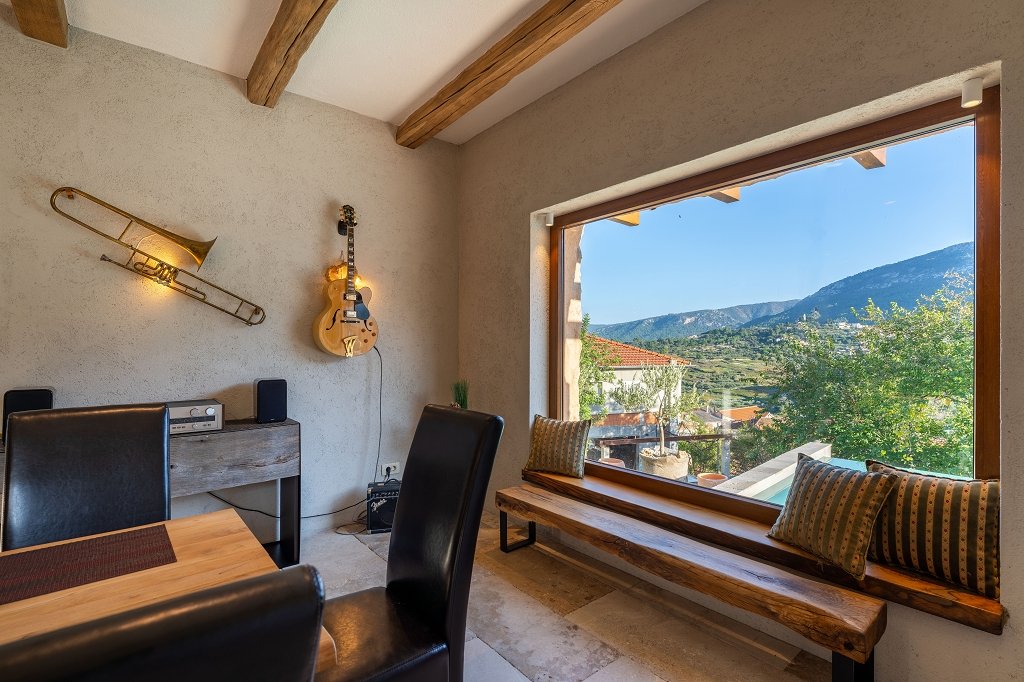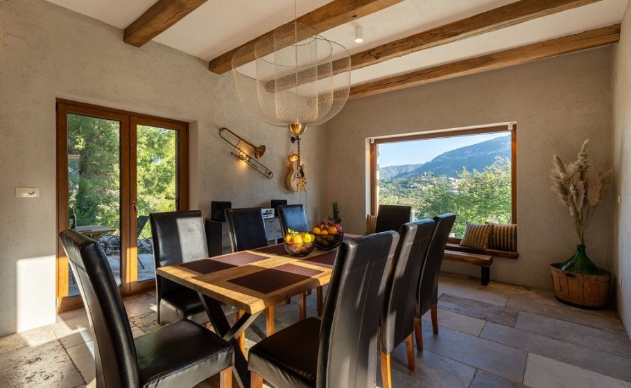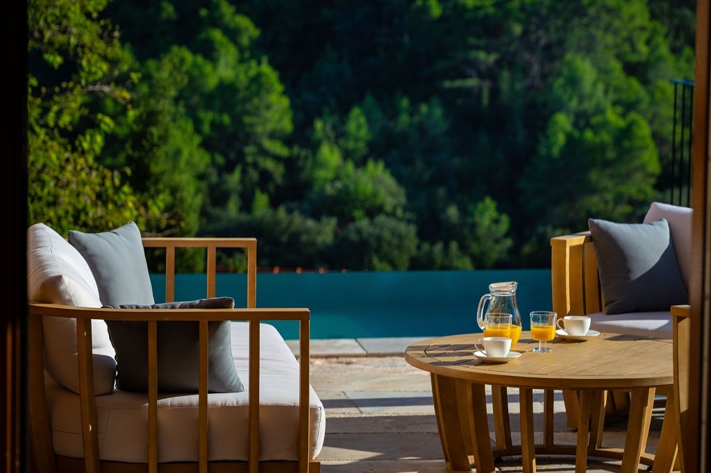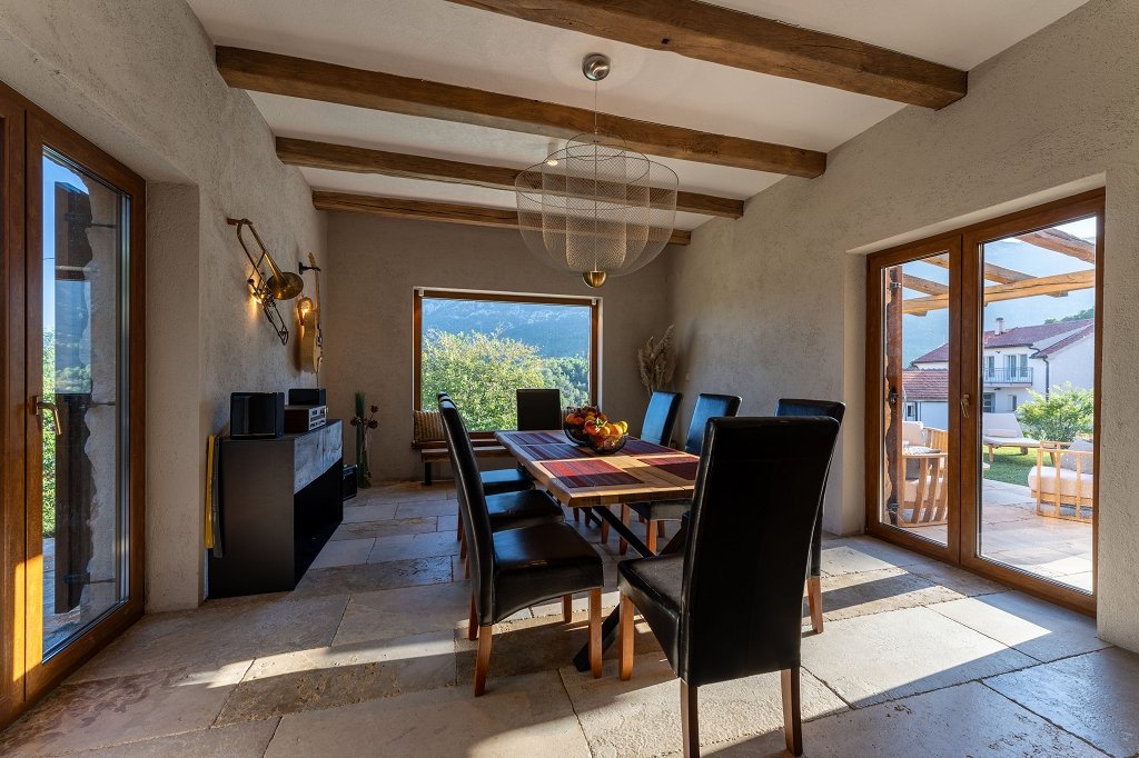 A centrally positioned dining table sits in front of a large picture window overlooking the infinity pool and the hills beyond. Between the dining and kitchen areas, a door leads out to a side terrace for easy outdoor access.