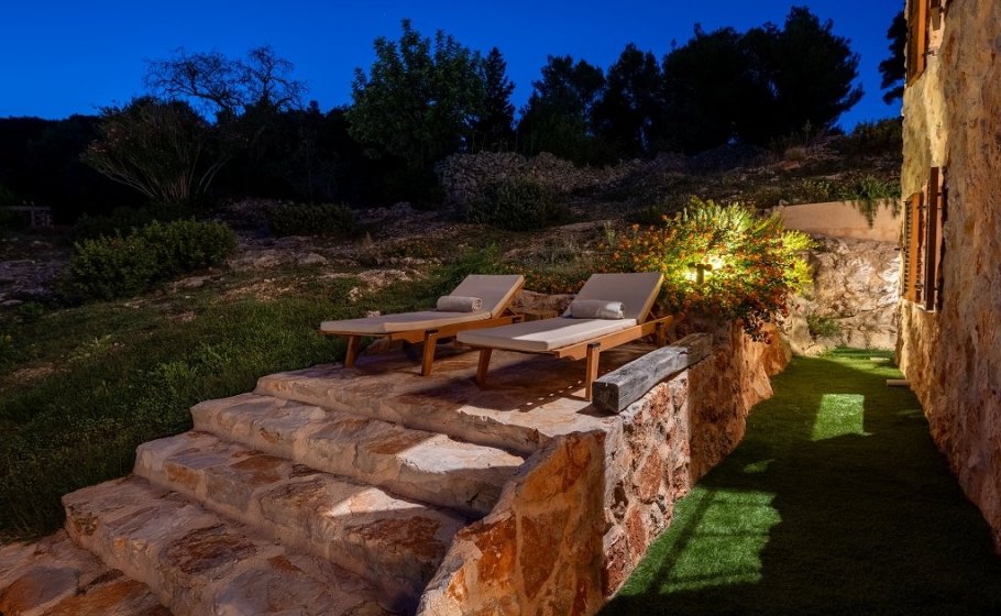 Sun Deck & Pavilion: Slightly elevated on the same side of the house, a stone platform hosts a swinging love seat and additional loungers—perfect for catching the afternoon sun.