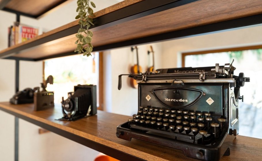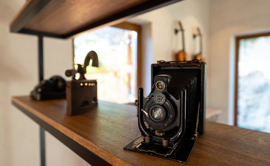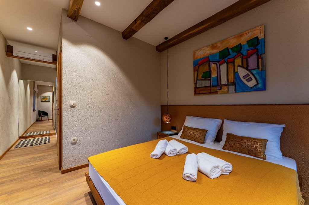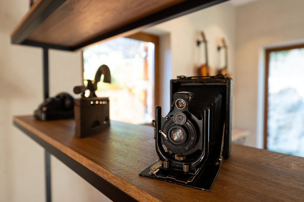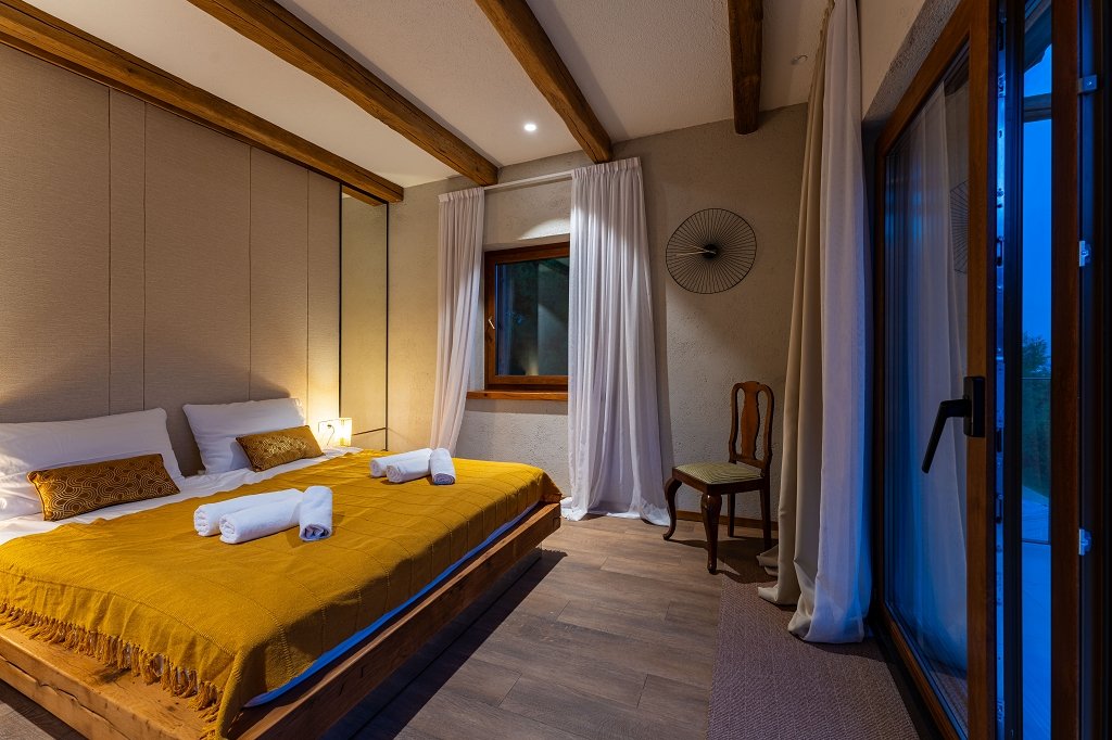 At the very top of the villa, a panoramic rooftop terrace offers a breathtaking vantage point over the countryside and a distant view of the Adriatic Sea. Partially shaded by a pergola and equipped with two sun loungers, it’s the perfect spot for a quiet moment, sunrise yoga, or sunset drinks.
