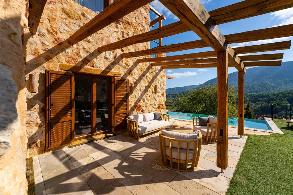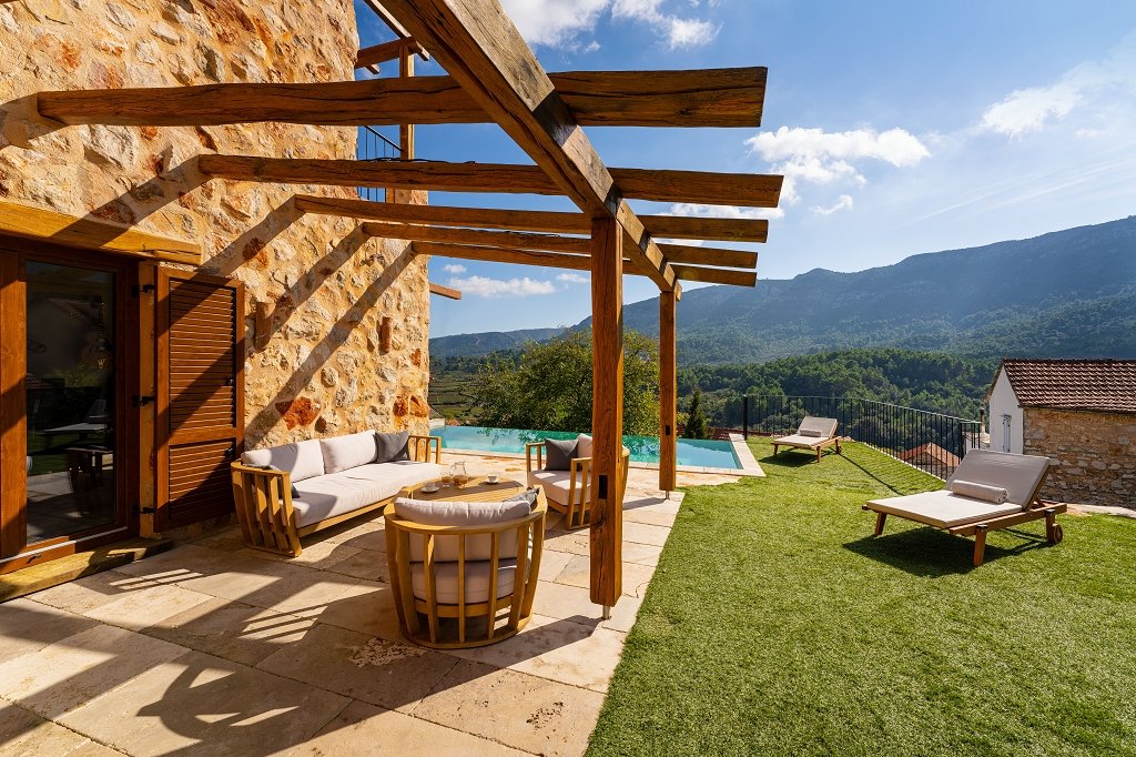 Main Lounge Terrace: Accessible through sliding doors from the living room, this shaded pergola area is furnished with a comfortable sofa and cushioned chairs—just steps away from the luxurious infinity pool and a row of inviting sun loungers.