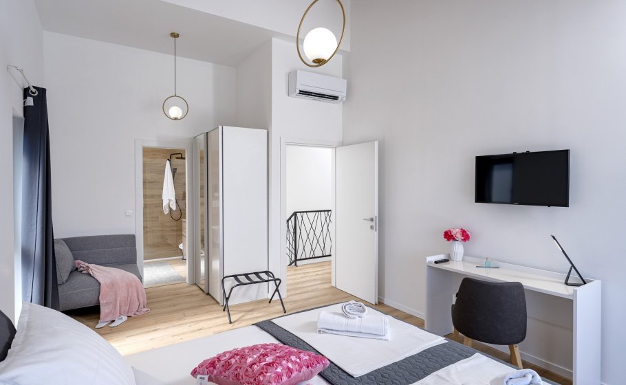 If we go back up the stairs and head up, we arrive on the first floor of the villa, with a hallway from which you enter the three bedrooms. Two bedrooms have large double beds and glass walls that lead directly to a 32m2 terrace with a magical view of the sea and the Adriatic archipelago. The third room has a smaller, French bed for children and those who feel like ones.