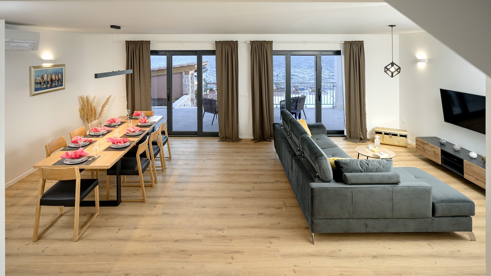 The dining and living room area opens through a large glass door to a 32m2 terrace with a beautiful, soothing view of the sea. The wonderful part is that all the interiors of the villa have a beautiful sea view, and the interiors of Villa Galateia are rather minimalist and neutral in color, so that nothing disturbs the zen and the main role of the blue sea.