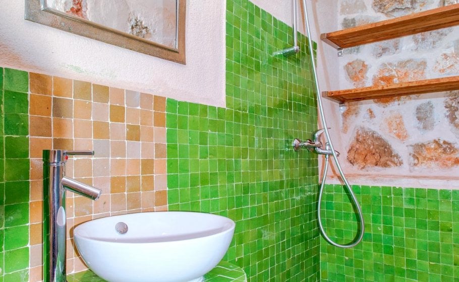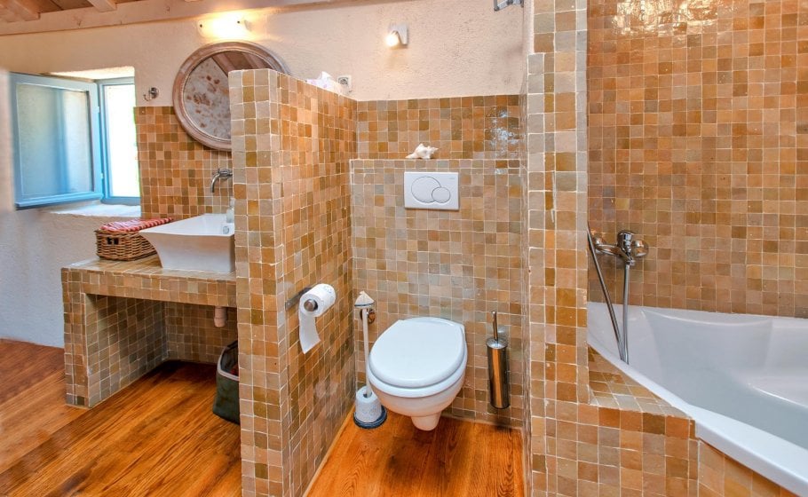 On the ground floor of the main house a large, fully equipped open plan kitchen is located. The kitchen has a direct access to terraces, namely the garden. A lovely open plan living room with its original features preserved is located on the first floor. The living room has a seating area and a wood-burning stove. The top floor consists of a loft-style open plan bedroom with a double bed (160 cm) and a large wardrobe. The bedroom is air-conditioned. An open plan en suite bathroom with a sink, toilet, bathtub and a shower booth is also located on the top floor.