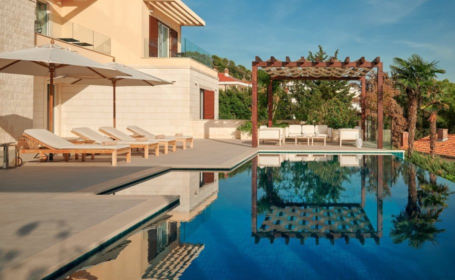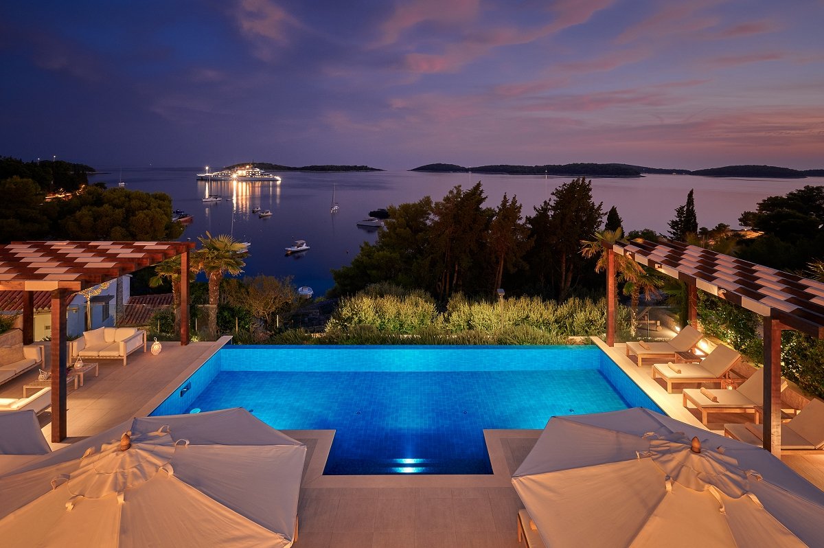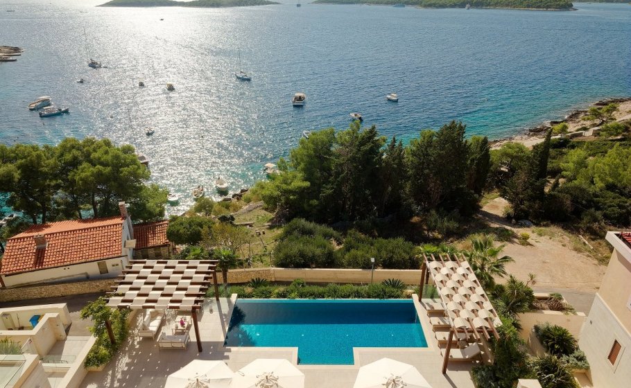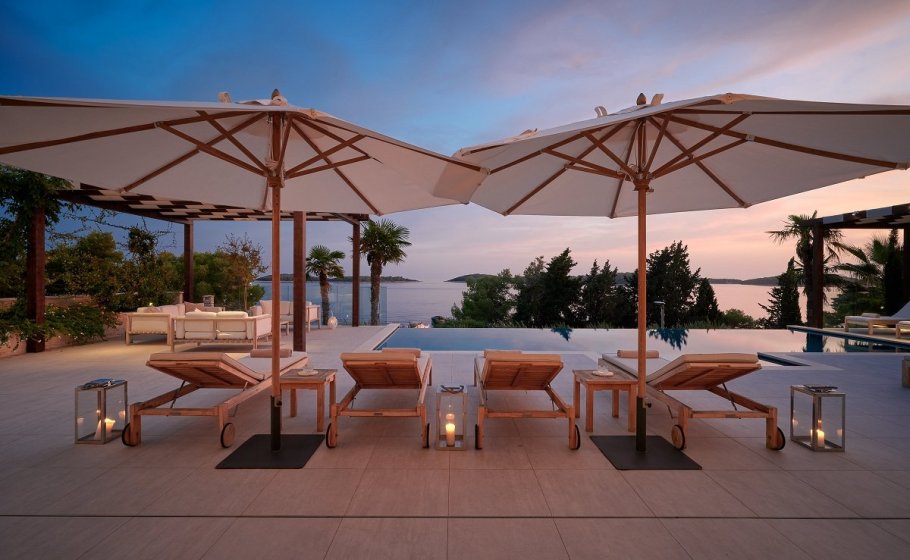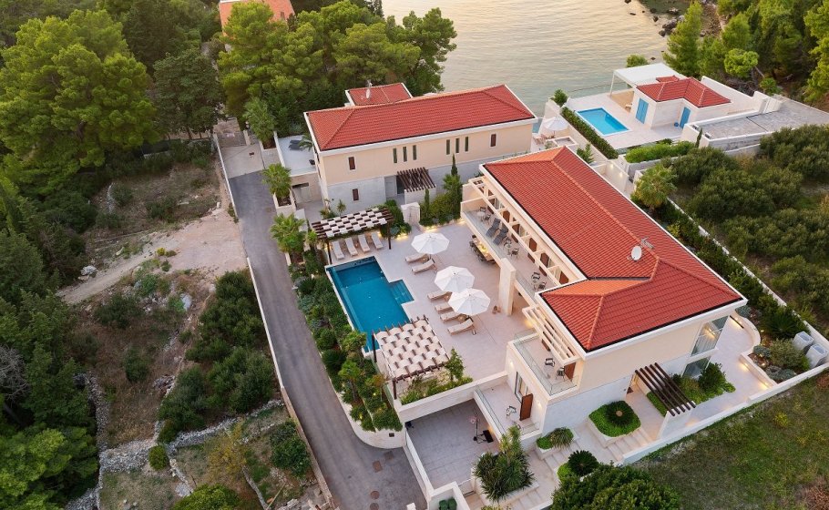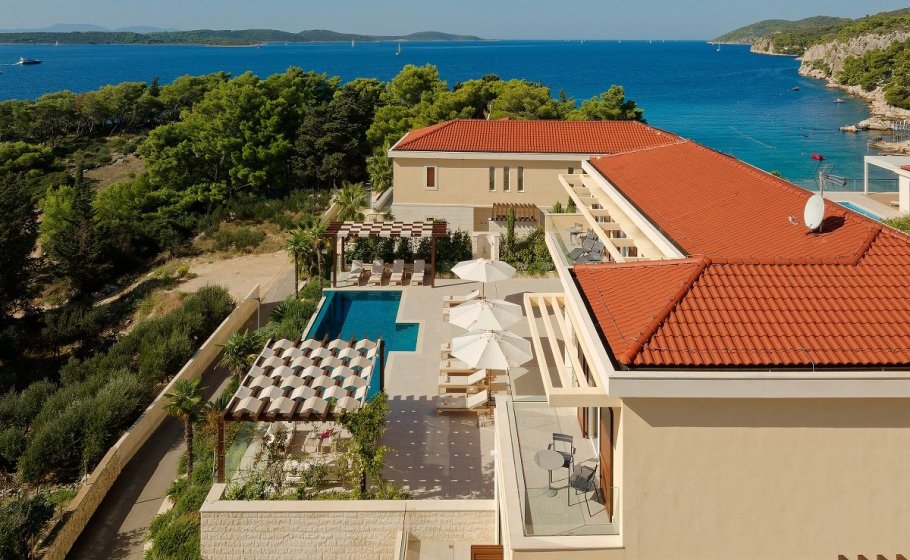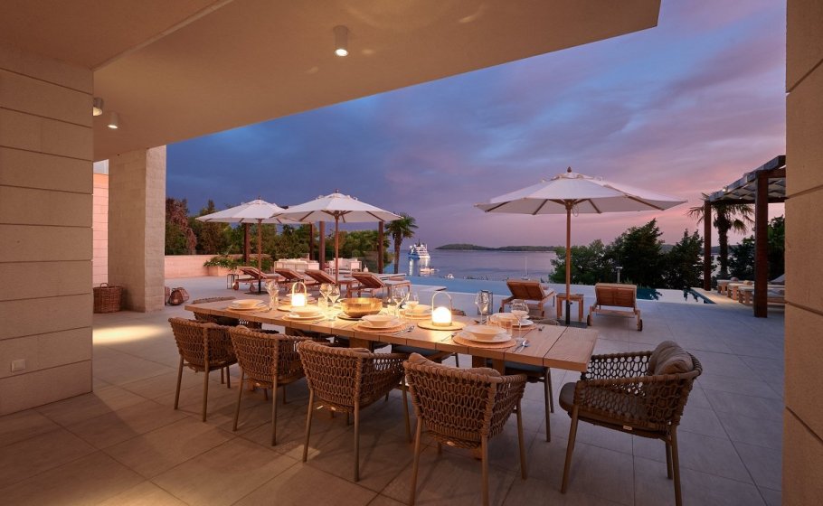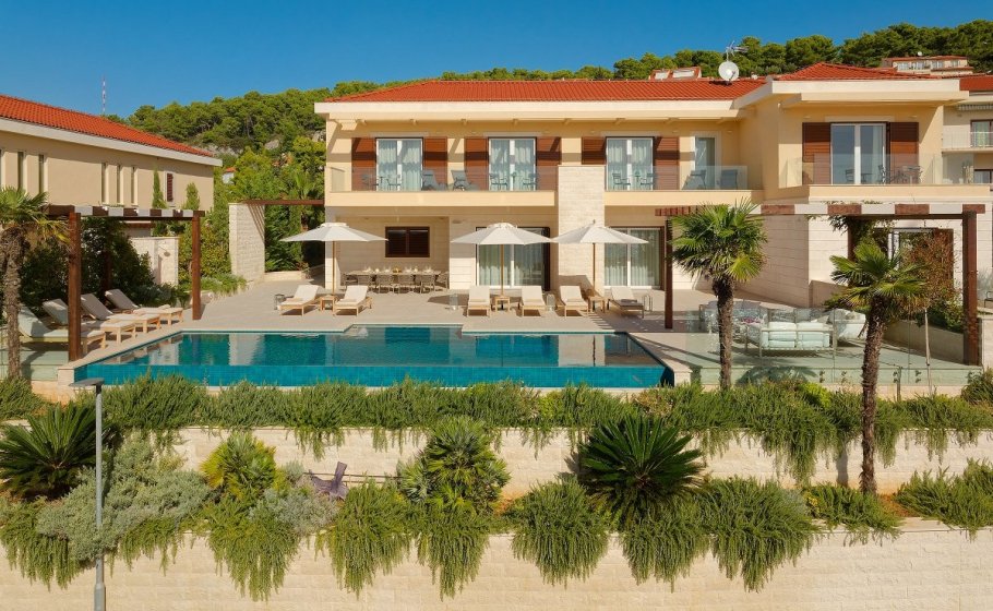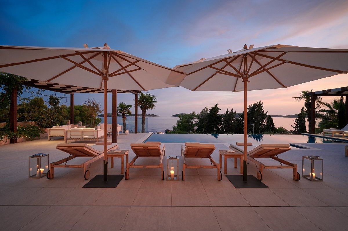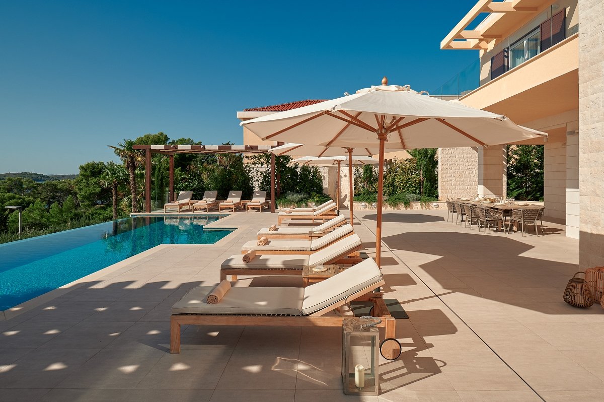 The villa can accommodate 10 persons in total. Guests have at their disposal 5 bedrooms, each with an en-suite bathroom, a HD satellite system (Astra), LCD TV, fiber-optic internet, dual-band Wi-Fi indoor and outdoor, SONOS music systems for public and outdoor areas, as well as Hitachi central air conditioning with individual room control. All the rooms have balconies, offering astonishing sea views. The outdoor space is enriched with several relaxing and dining areas: the main terrace with a table for 10 persons, a lounge area, a pool area with sunbeds and sun umbrellas, all overlooking the beautiful deep blue, pines, palm trees, and Pakleni Islands. Suffice to say that next to these villas is the presidential villa, and we all know that presidents love the best things life has to offer.