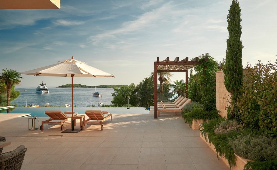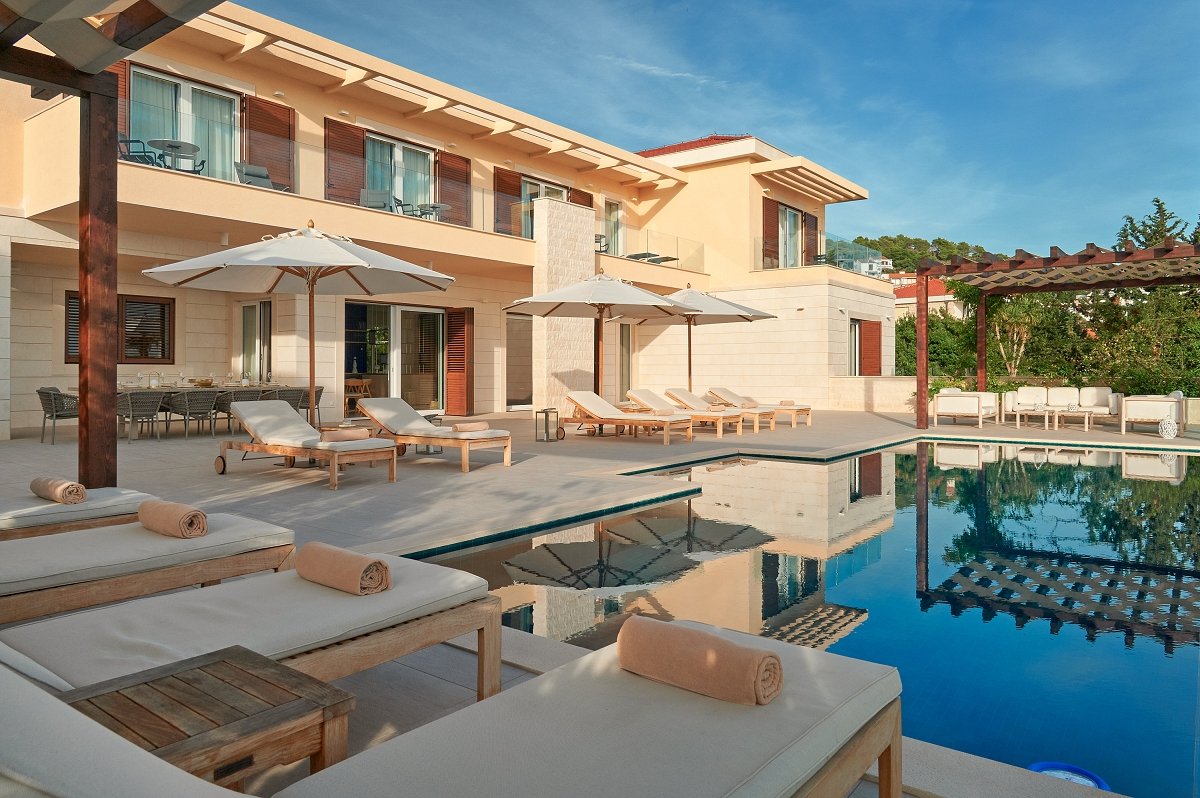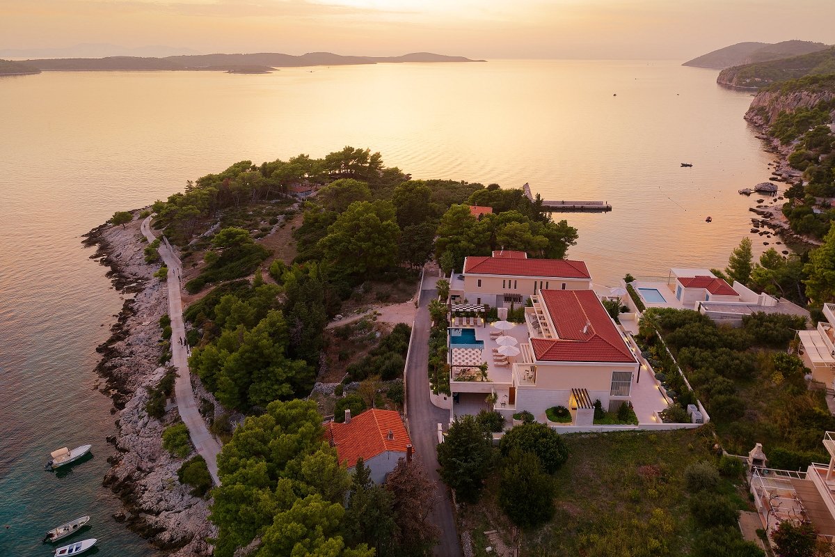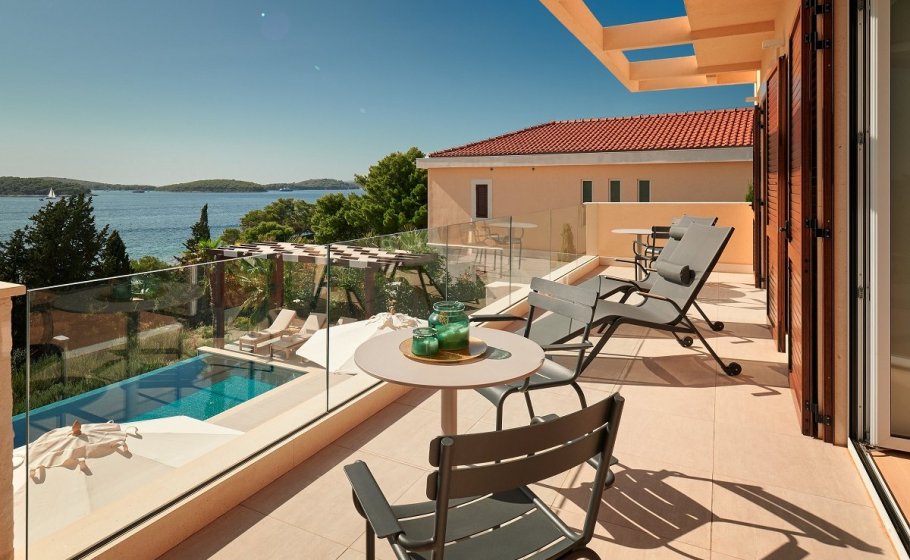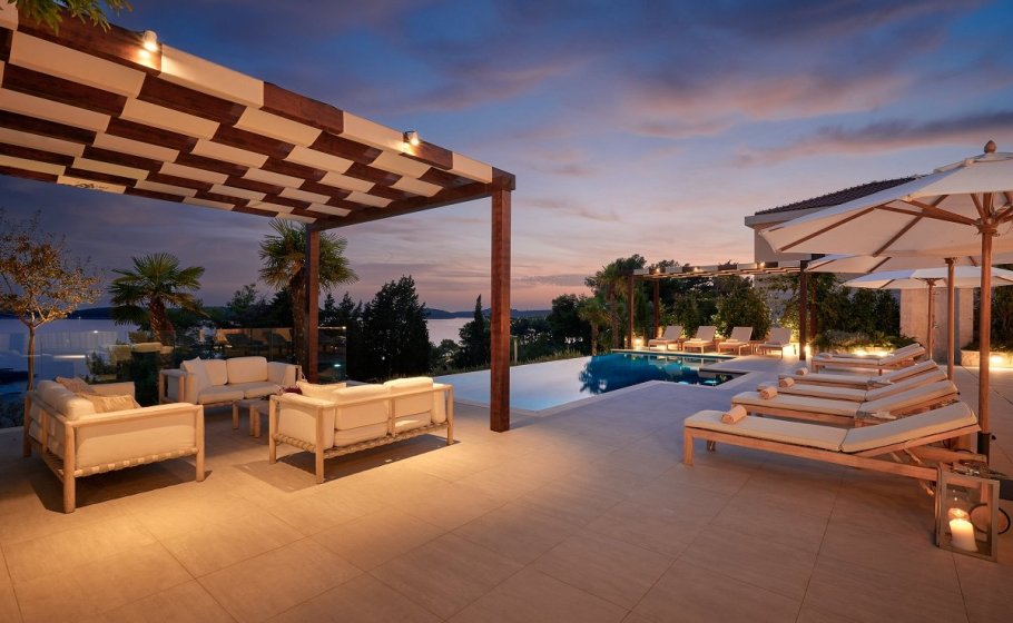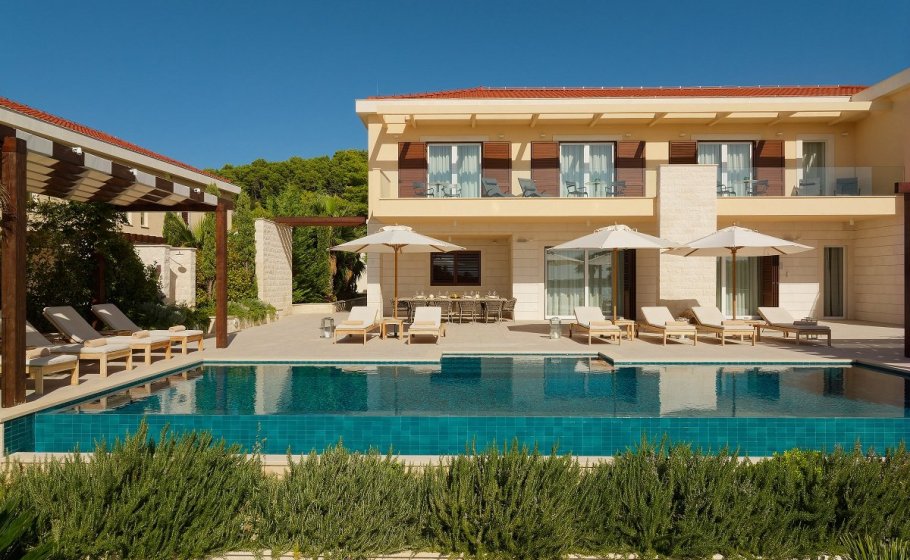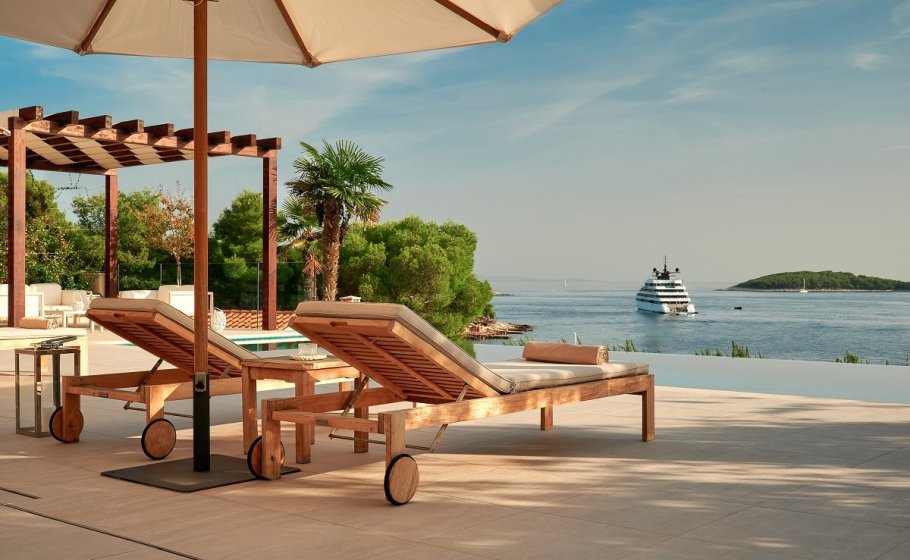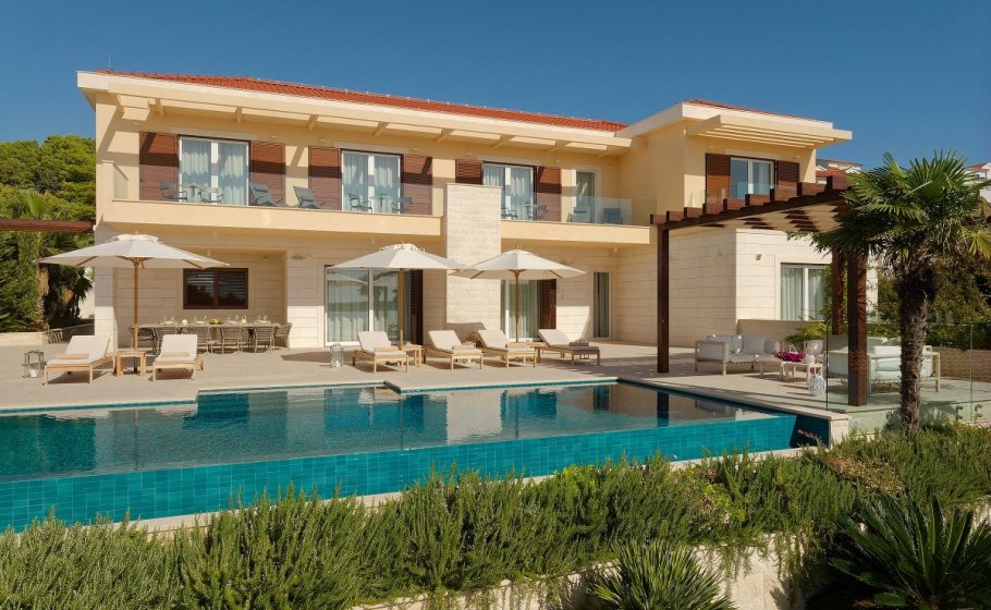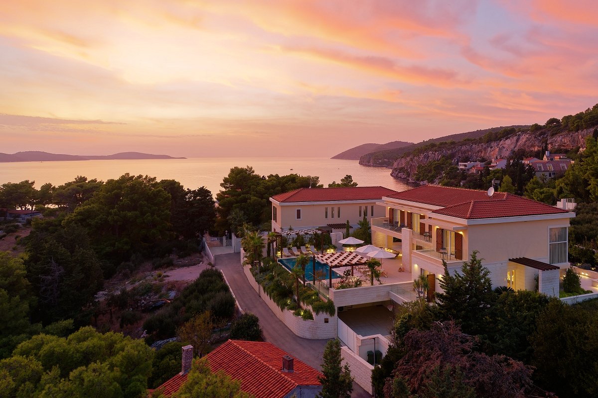 The villa can accommodate 10 persons in total. Guests have at their disposal 5 bedrooms, each with an en-suite bathroom, a HD satellite system (Astra), LCD TV, fiber-optic internet, dual-band Wi-Fi indoor and outdoor, SONOS music systems for public and outdoor areas, as well as Hitachi central air conditioning with individual room control. All the rooms have balconies, offering astonishing sea views. The outdoor space is enriched with several relaxing and dining areas: the main terrace with a table for 10 persons, a lounge area, a pool area with sunbeds and sun umbrellas, all overlooking the beautiful deep blue, pines, palm trees, and Pakleni Islands. Suffice to say that next to these villas is the presidential villa, and we all know that presidents love the best things life has to offer.