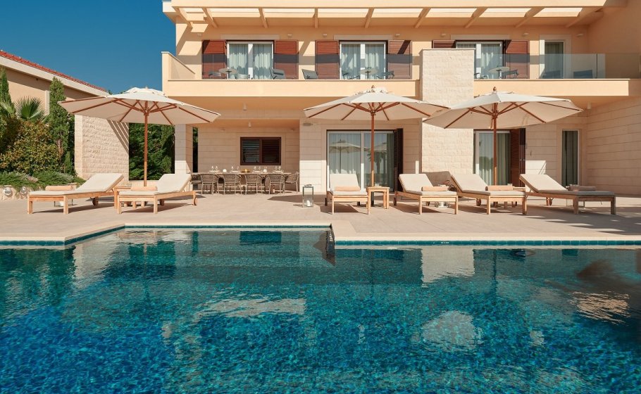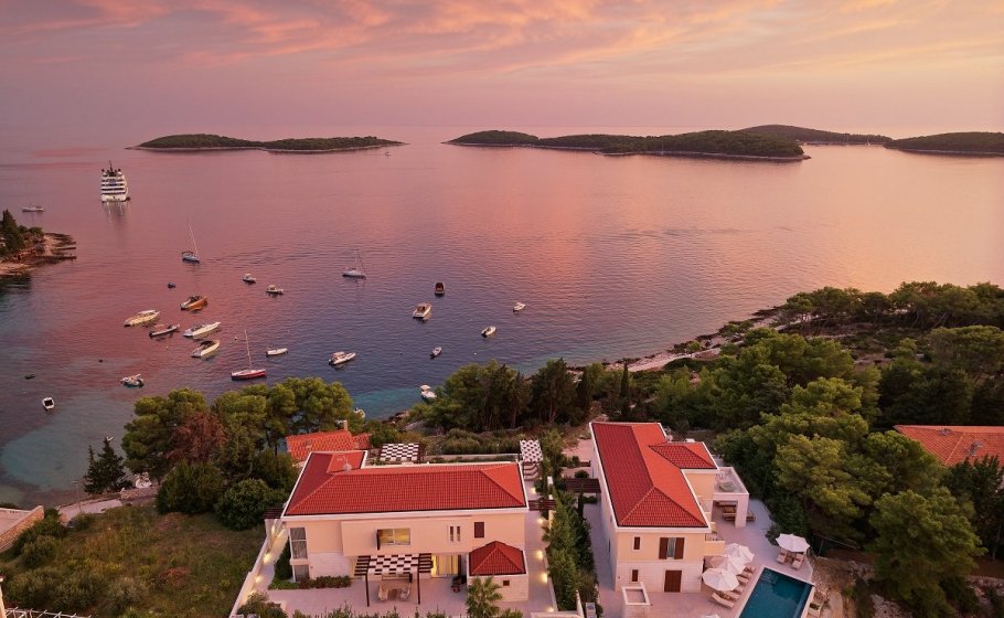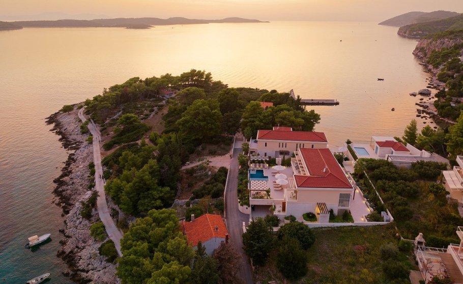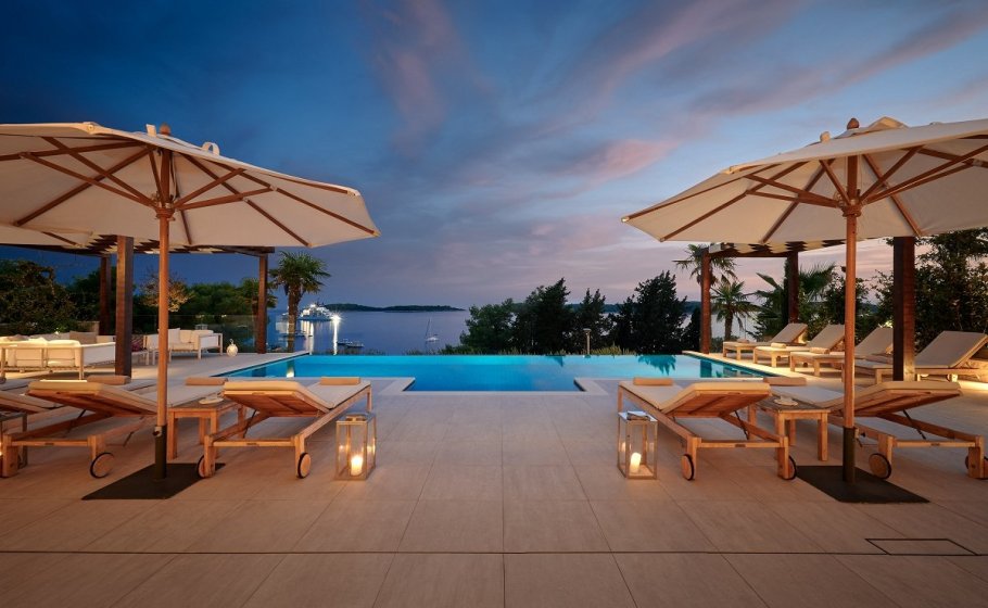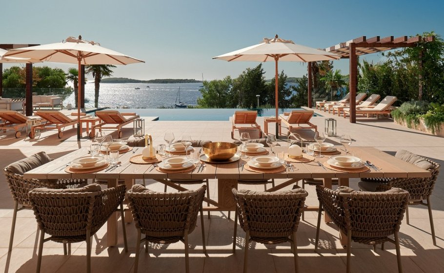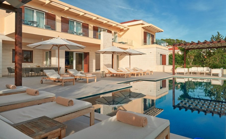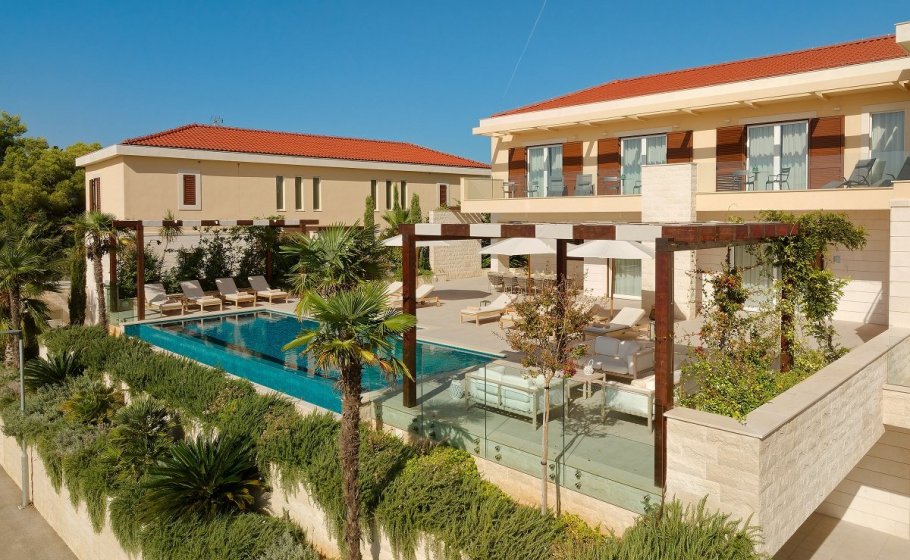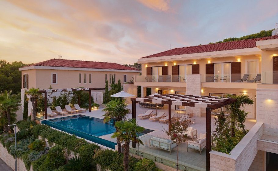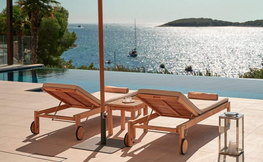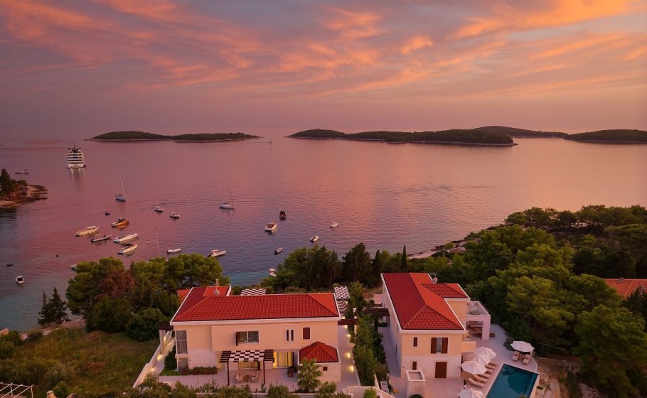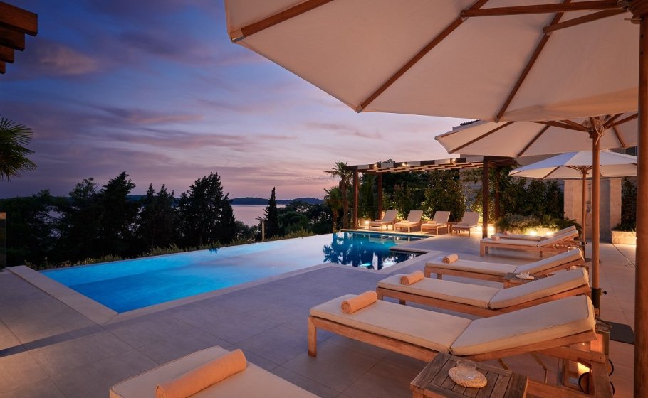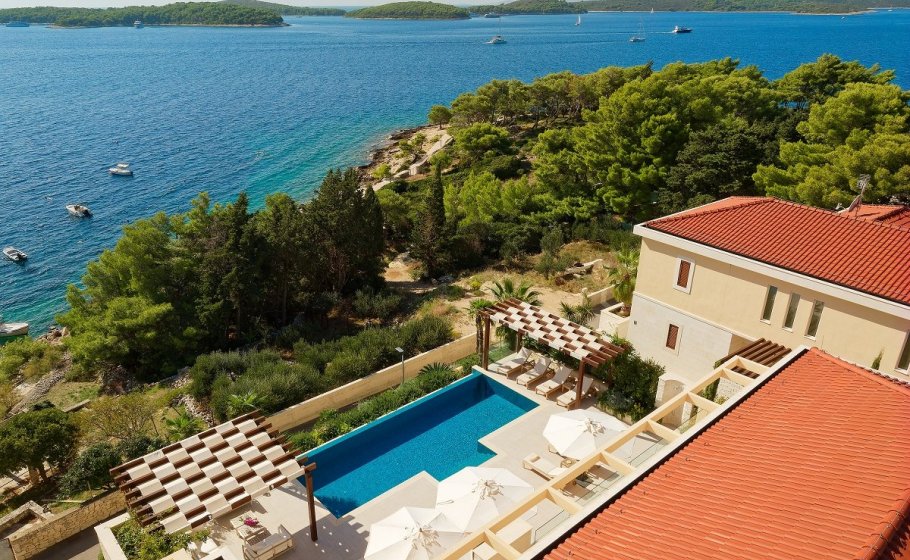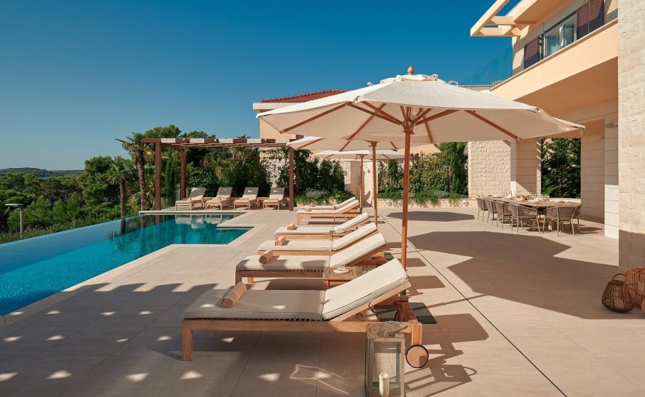 The villa can accommodate 10 persons in total. Guests have at their disposal 5 bedrooms, each with an en-suite bathroom, a HD satellite system (Astra), LCD TV, fiber-optic internet, dual-band Wi-Fi indoor and outdoor, SONOS music systems for public and outdoor areas, as well as Hitachi central air conditioning with individual room control. All the rooms have balconies, offering astonishing sea views. The outdoor space is enriched with several relaxing and dining areas: the main terrace with a table for 10 persons, a lounge area, a pool area with sunbeds and sun umbrellas, all overlooking the beautiful deep blue, pines, palm trees, and Pakleni Islands. Suffice to say that next to these villas is the presidential villa, and we all know that presidents love the best things life has to offer.