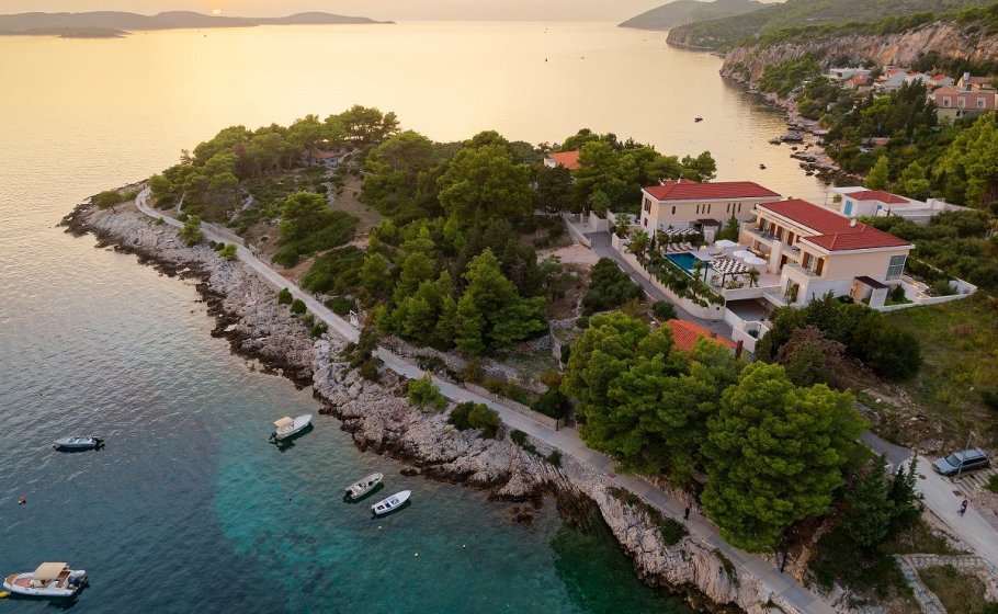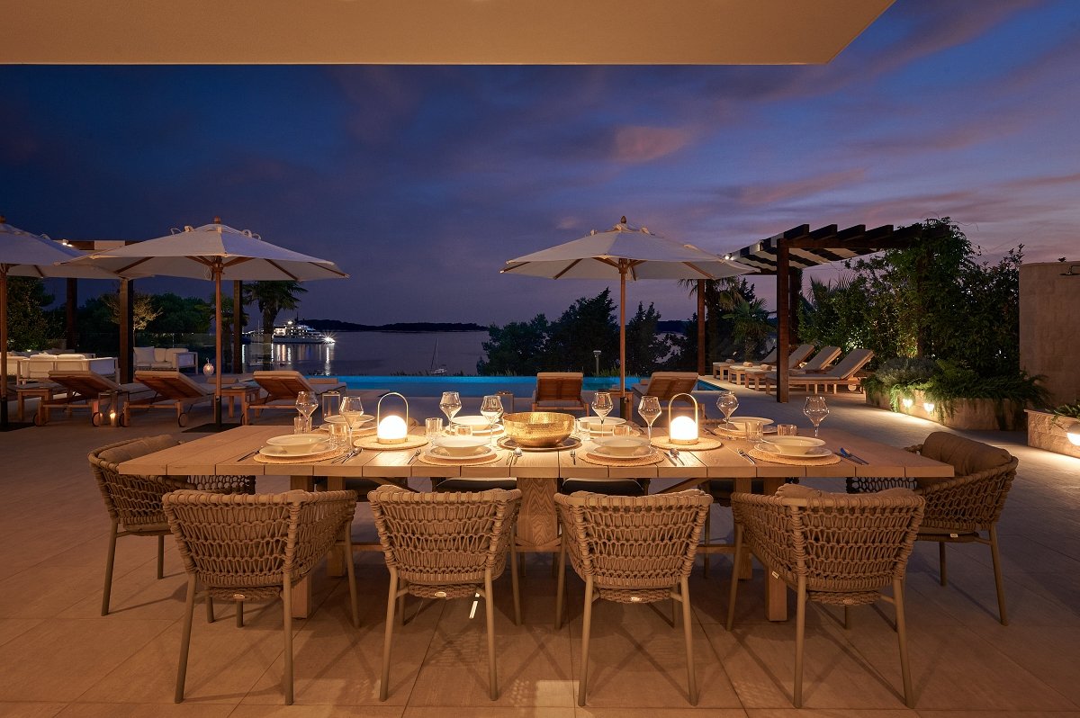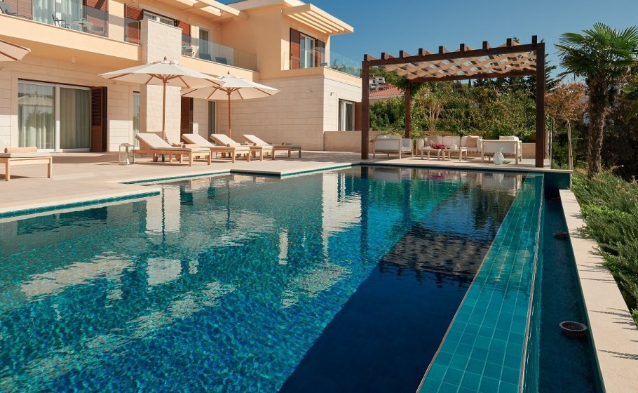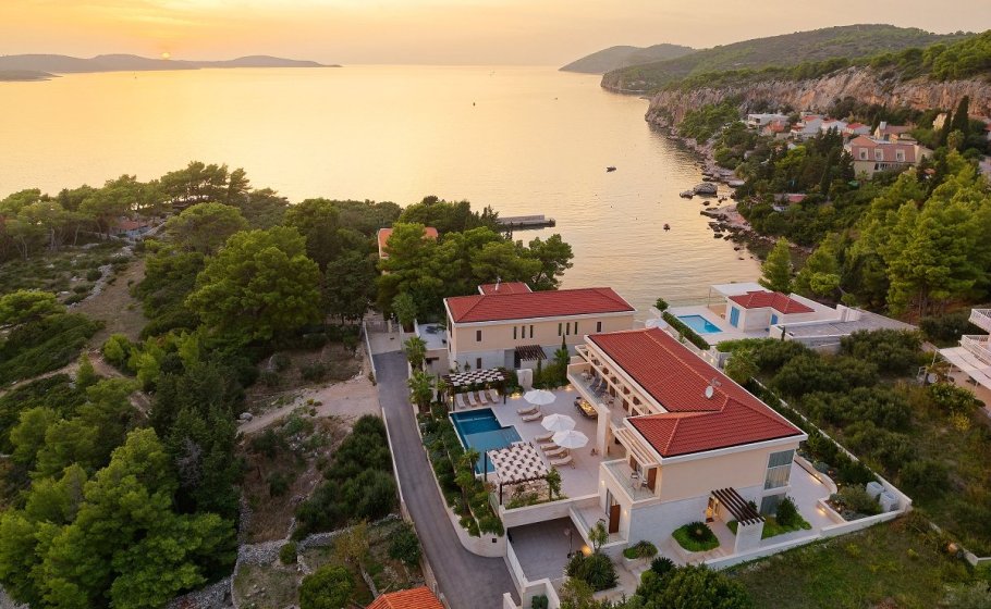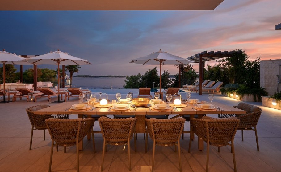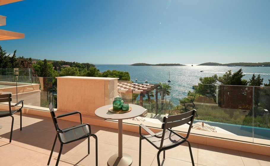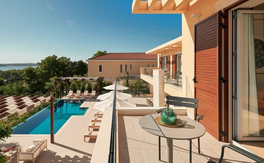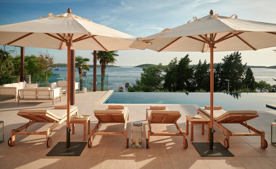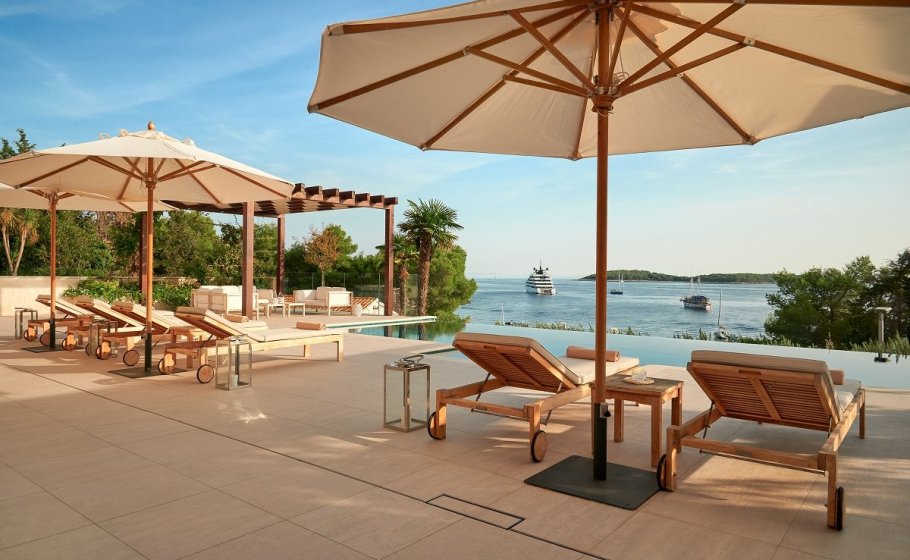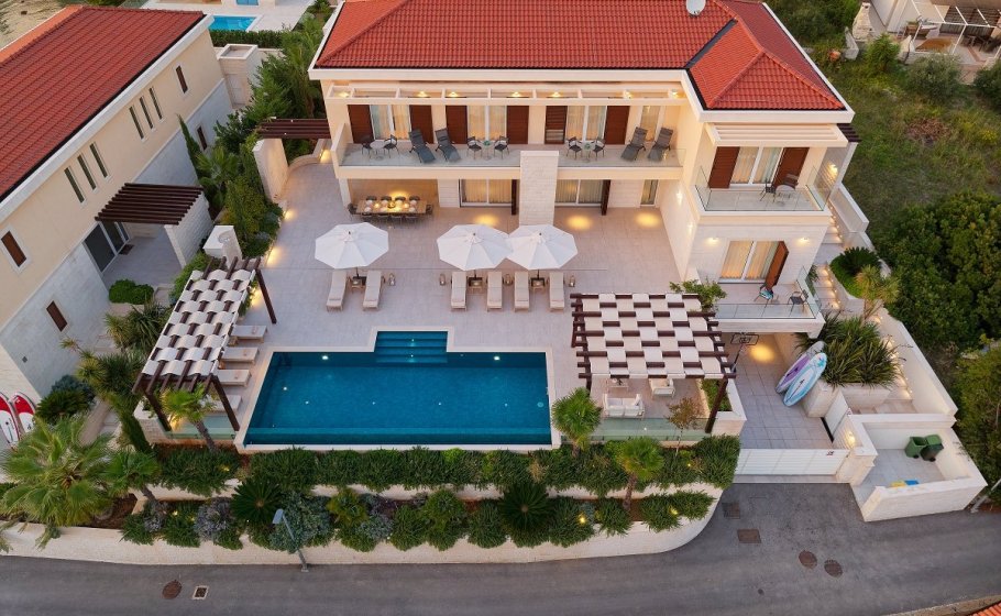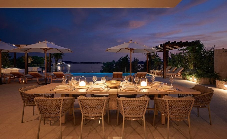 The villa can accommodate 10 persons in total. Guests have at their disposal 5 bedrooms, each with an en-suite bathroom, a HD satellite system (Astra), LCD TV, fiber-optic internet, dual-band Wi-Fi indoor and outdoor, SONOS music systems for public and outdoor areas, as well as Hitachi central air conditioning with individual room control. All the rooms have balconies, offering astonishing sea views. The outdoor space is enriched with several relaxing and dining areas: the main terrace with a table for 10 persons, a lounge area, a pool area with sunbeds and sun umbrellas, all overlooking the beautiful deep blue, pines, palm trees, and Pakleni Islands. Suffice to say that next to these villas is the presidential villa, and we all know that presidents love the best things life has to offer.