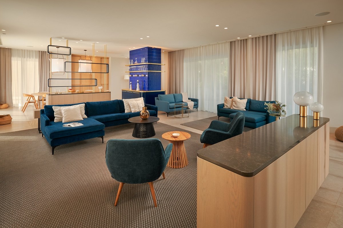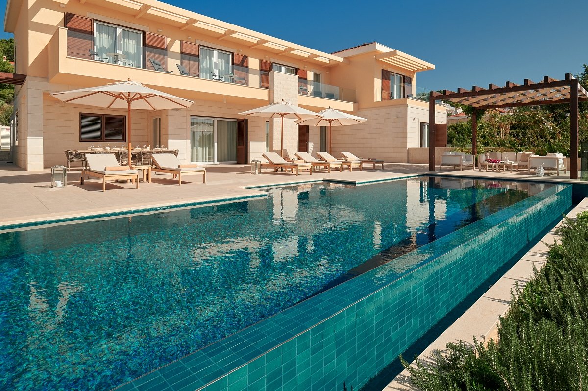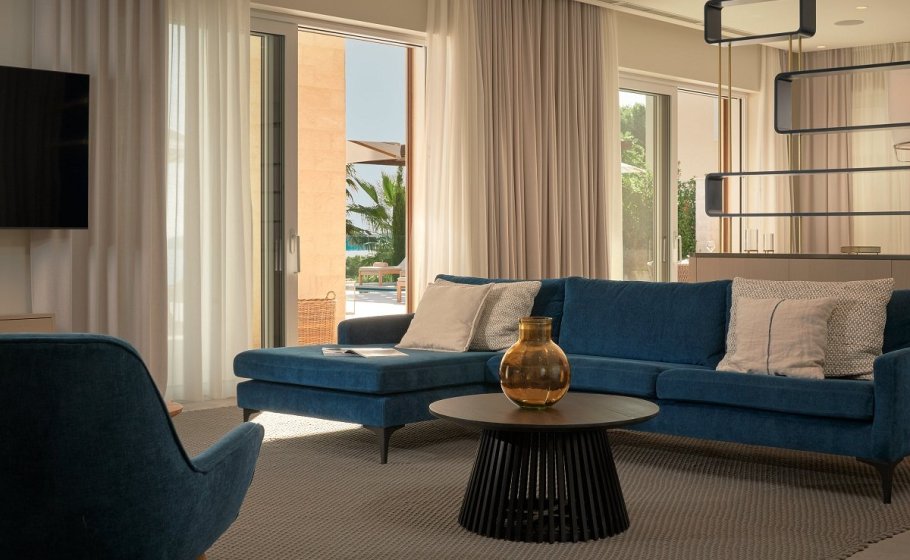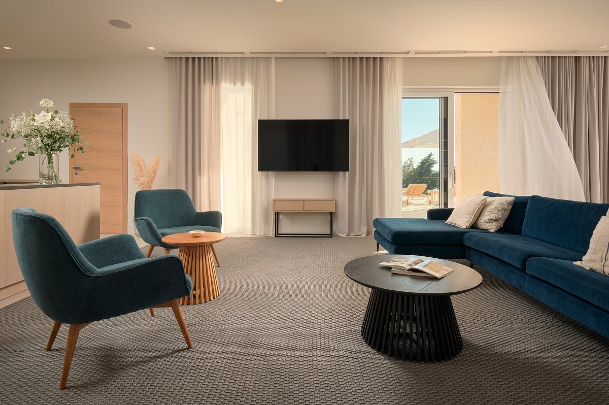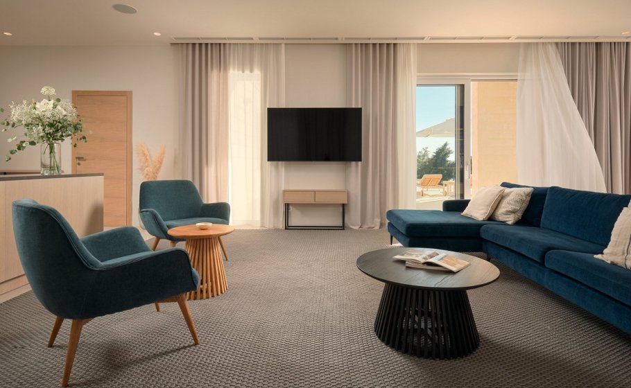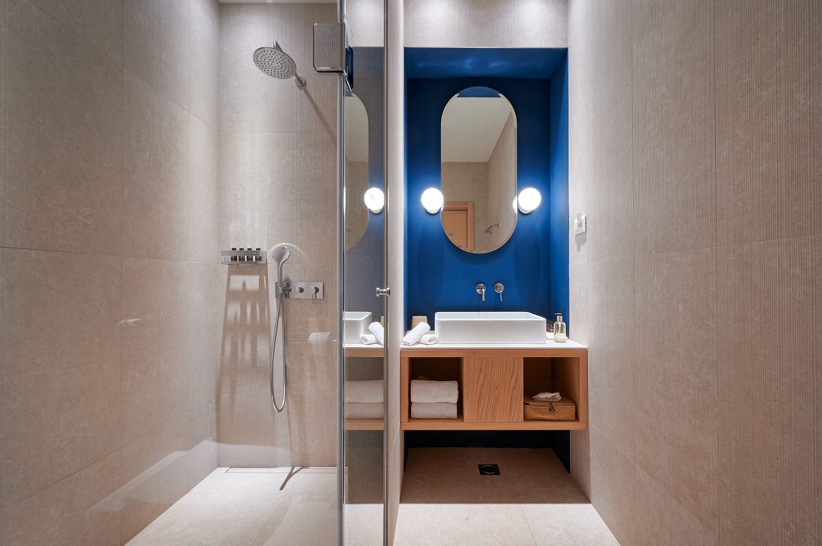 On the first floor of Hermes Blue, there are 4 bedrooms with king size beds (200x210cm). All bedrooms have en-suite bathrooms with walk-in showers, hairdryers, and all the necessary amenities. All have direct access to the sea view balcony, a 55-inch smart TV, cabled and Wi-Fi Internet access. Also, each room has its own wardrobe with an integrated safe. Two of the mentioned king size beds can be converted into twin beds (100x210m each), according to your personal needs and wishes.