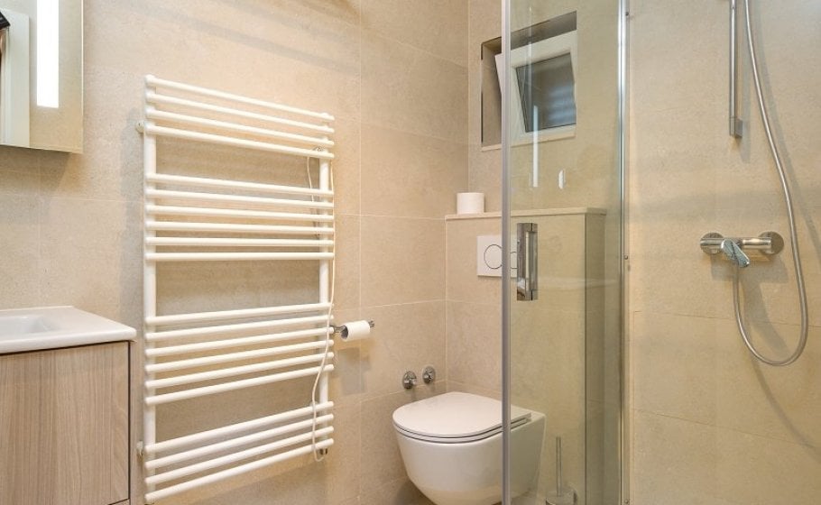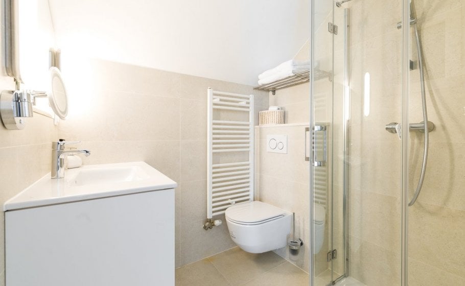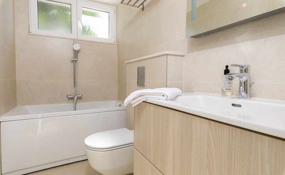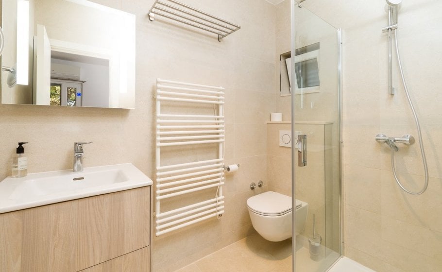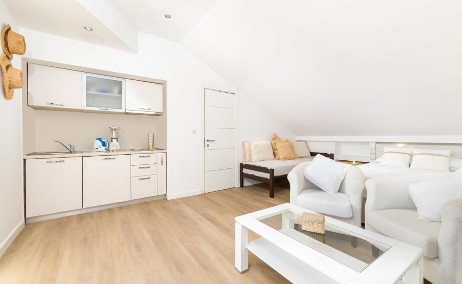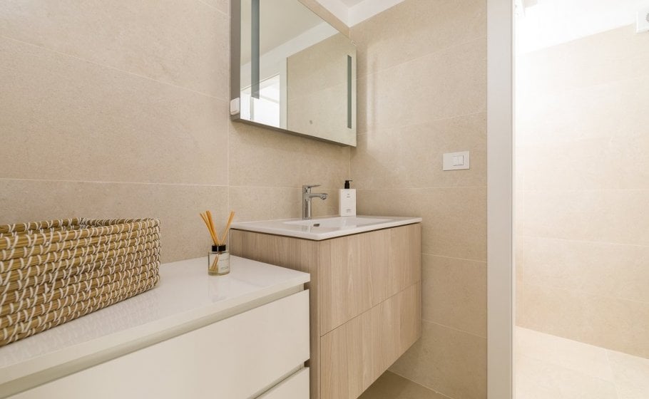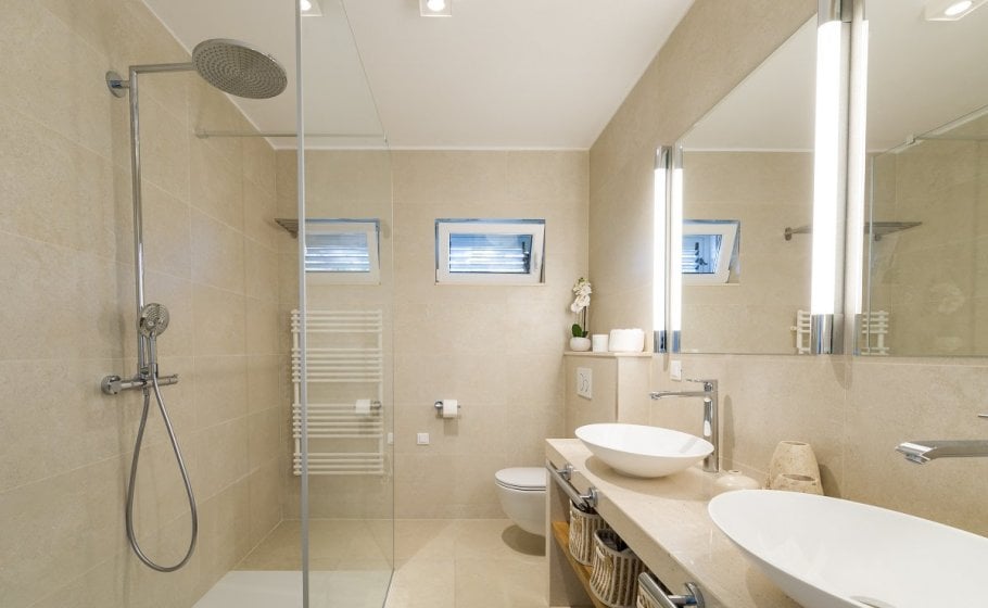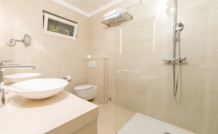 This might be a good time to mention that all bedrooms have matrimonial beds (160 cm). Three bedrooms, one on the low ground floor, one on the first floor and one in the attic, have kitchenettes. Only one bedroom – the separate one on the low ground floor – has a bathroom with a bathtub; all other bathrooms in the villa have shower tray.