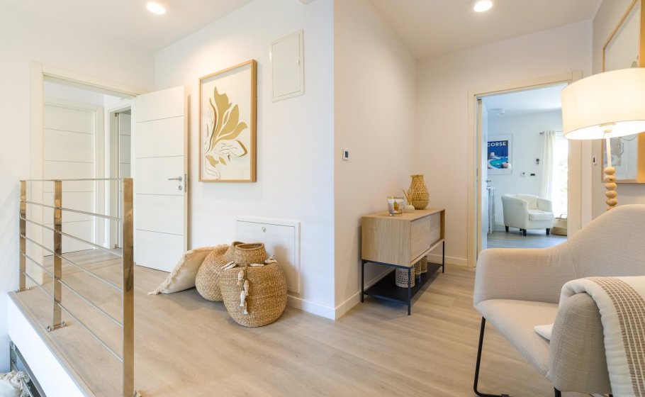 The first floor of Villa Nereus, which can be reached from the back of the villa on the outside but also from the inside, consists of four bedrooms, each with an en-suite bathroom and balcony facing east, south, and west respectively, overlooking the open sea. The sizes of the bedrooms are 11m2, 13m2, 18m2, and 22m2. On the first floor, there is a fifth bedroom of 10m2 without an en-suite bathroom, which can be reached through one of the already mentioned four bedrooms.