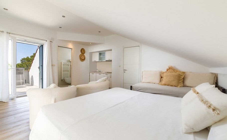 You enter the second floor, that is, the attic from an outside entrance at the back of the villa. In the attic of the villa there are two large bedrooms, each with its an en-suite bathroom, one of which has a separate wardrobe. Both rooms have access to fenced balconies from which you can see how beautiful the exterior of the villa is from a bird's eye view, but also how divine the view of the open sea, the town of Hvar, and the Pakleni islands is...