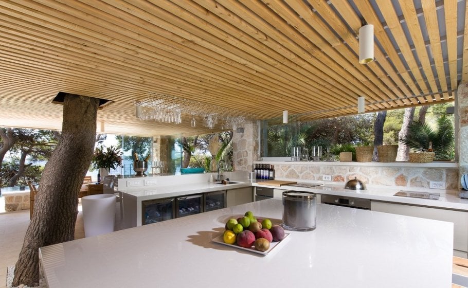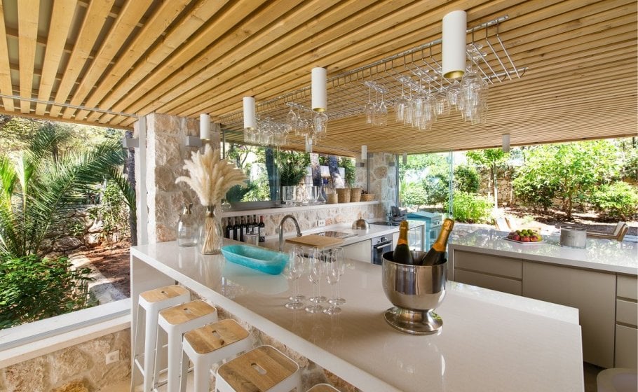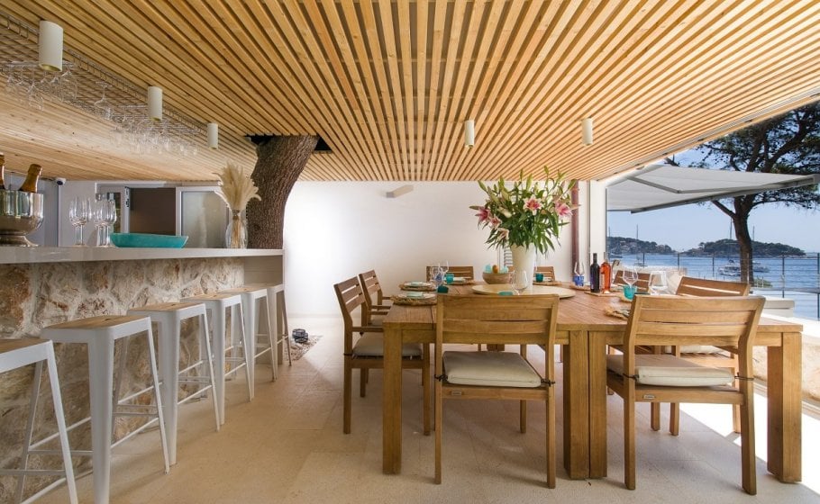 On the west side of the house there is a beautifully constructed pergola with an outstanding outdoor kitchen and an outdoor dining area overlooking the infinity pool, pine trees, and the sea. There is also a bar, bar stools, professional kitchen equipment, a professional grill… The smell of grilled fish mixes with the scents of resin and salt. Is there a more beautiful thing? The scents and colors of the Mediterranean can rarely be experienced so strongly, so intoxicatingly, as on the terraces of Nereus. A detail that we particularly love and appreciate in this space is the old pine tree, which was not removed during the renovation, but the renovation was done in a way that everything in the space adapts to the old pine tree, which has rightly become a star. A small but beautiful example of the coexistence of nature and man in harmony.