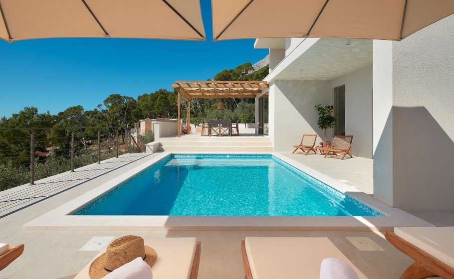 Villa Prometheus will be an ideal choice for all aesthetes, but also for those who love modern architecture, minimalist interiors, natural materials (wood, concrete, and stone), neutral colors (all shades of brown, gray, tan, and navy blue somewhere in the distance ), designer furniture, and carefully selected details.